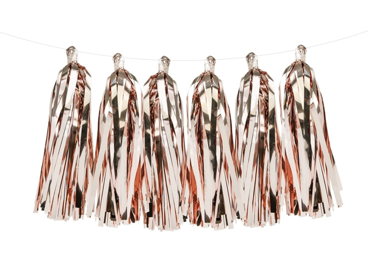 Ghirlanda cu ciucuri din aur roz este un accesoriu unic care va face din ziua ta de naștere o sărbătoare memorabilă. Acest decor nu este doar frumos, ci și ușor de asamblat, astfel încât să puteți crea singur o ghirlandă unică pentru a adăuga strălucire și farmec petrecerii dvs.