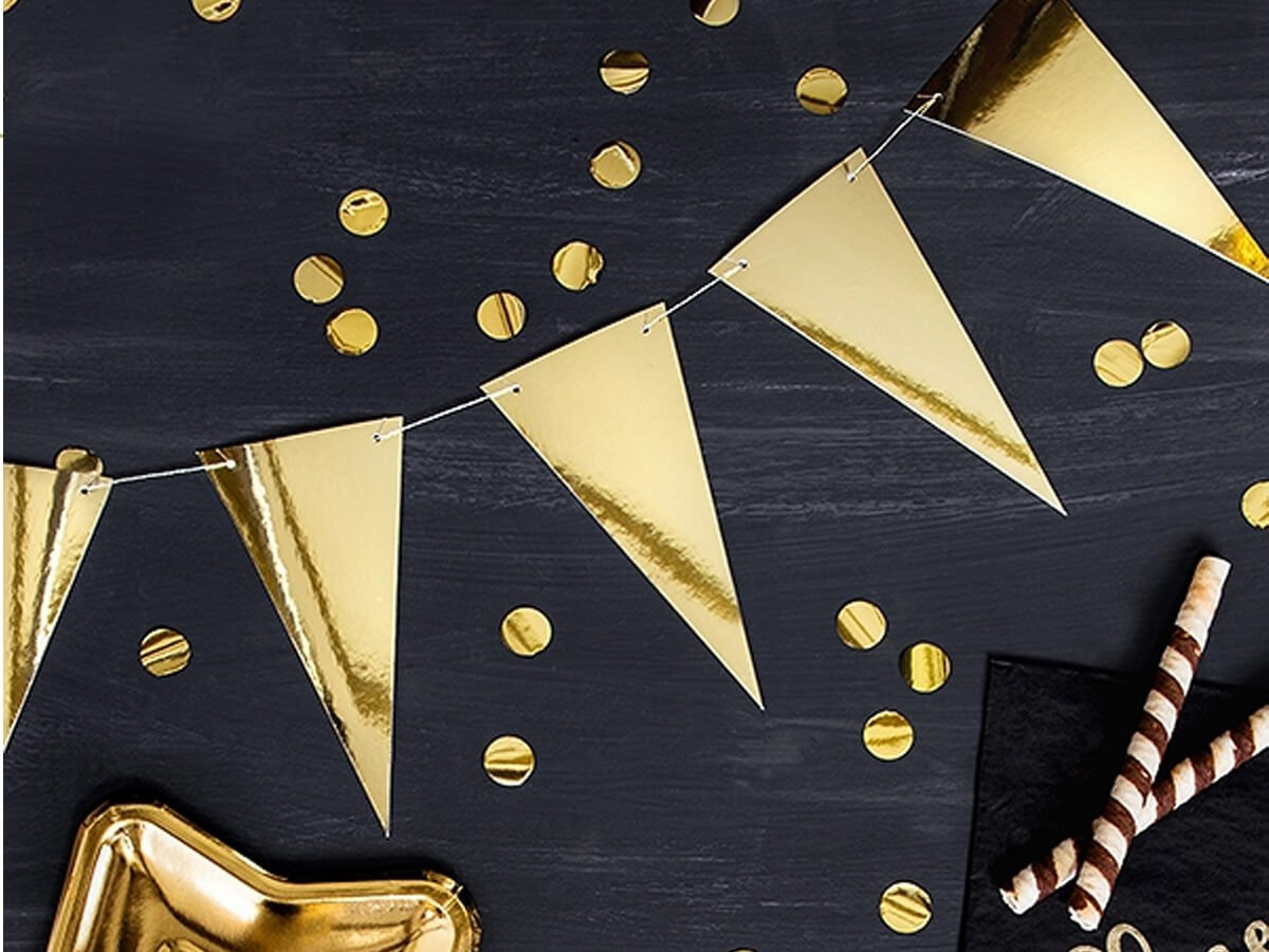 Descoperiți magia momentului cu ghirlanda noastră Golden Flag Flagship - elementul decorativ perfect pentru a da petrecerii dvs. de Anul Nou o notă unică și specială.