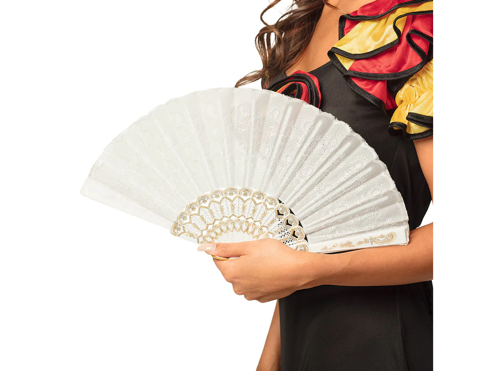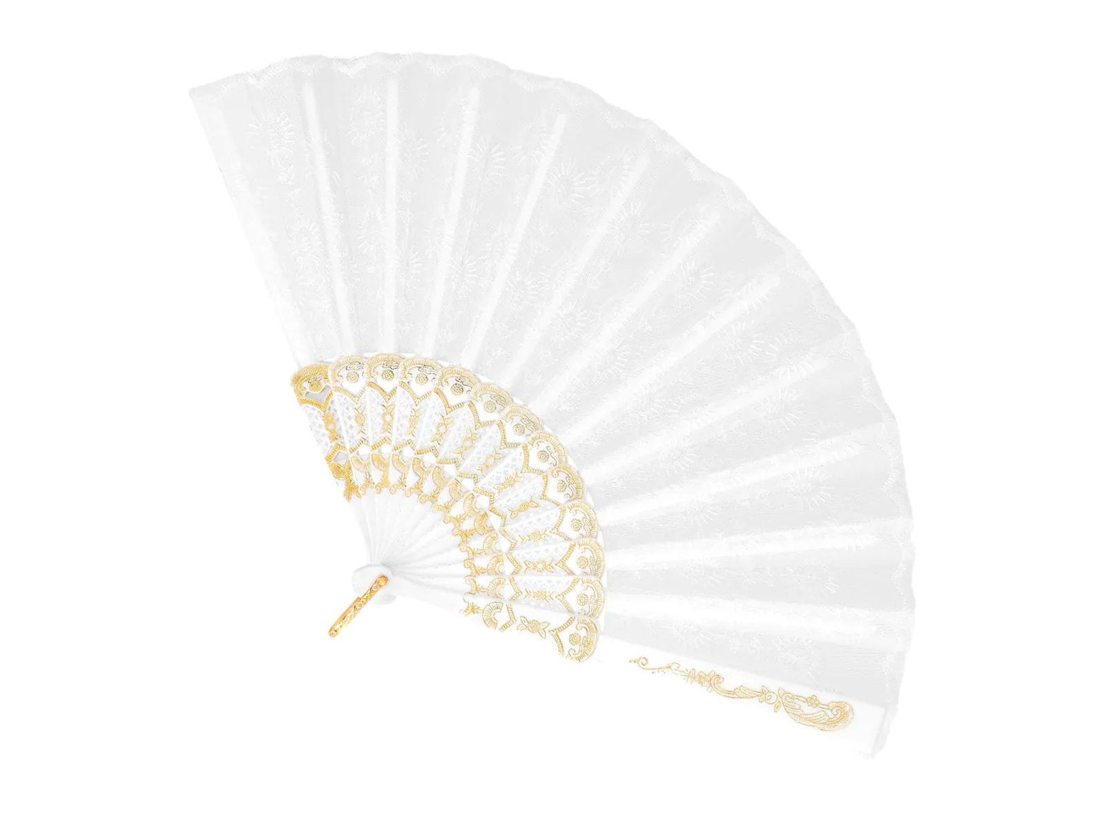 Ventilatorul nostru în alb cu design auriu este fabricat din materiale de cea mai înaltă calitate, ceea ce îi garantează durabilitatea și rezistența. Modelul auriu care împodobește acest evantai este extrem de detaliat și precis, adăugând eleganță și lux.