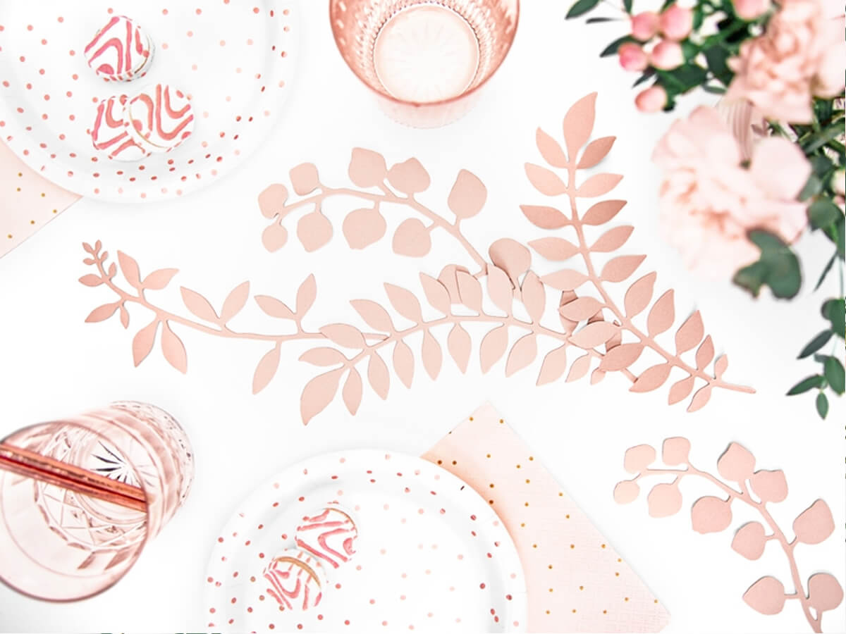 Punctele metalice din aur roz pe un fundal alb creează un contrast izbitor care atrage privirea și adaugă strălucire oricărei sărbători.
