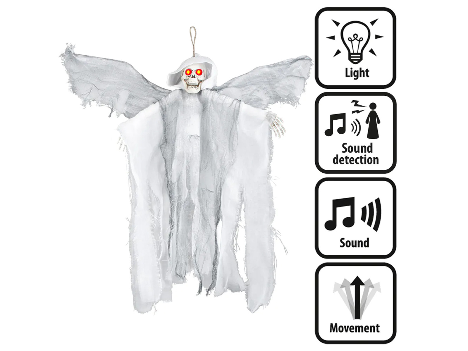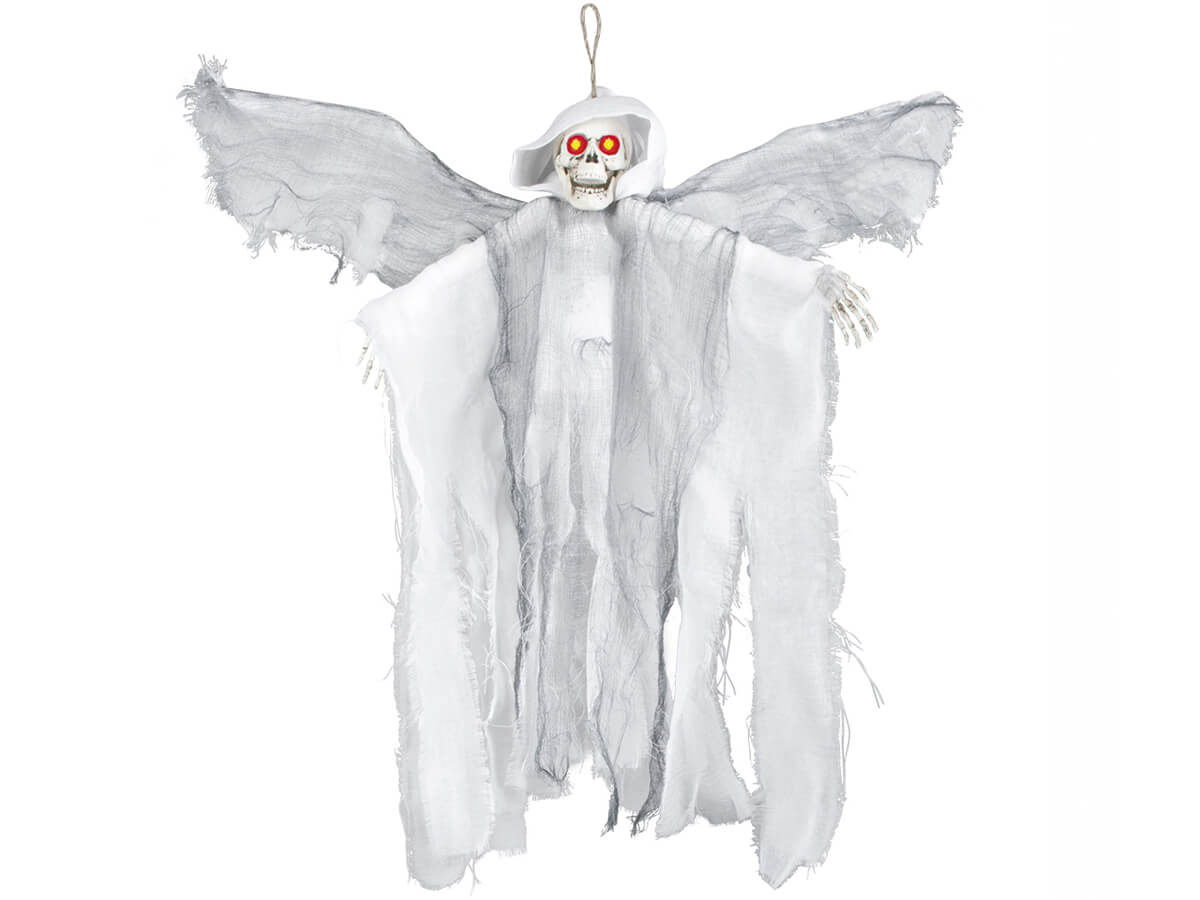 Impresionează-ți oaspeții de Halloween cu o decorațiune suspendată neobișnuită Demon înaripat într-o mantie albă. Modelul oferit are o dimensiune impresionantă de 52 cm, ceea ce îl face ideal pentru a fi agățat în pragul unei uși, pe o fereastră sau ca element central al unei petreceri. Inspirați respect și admirație oaspeților dvs. prin adăugarea unei atmosfere de mister și teamă.