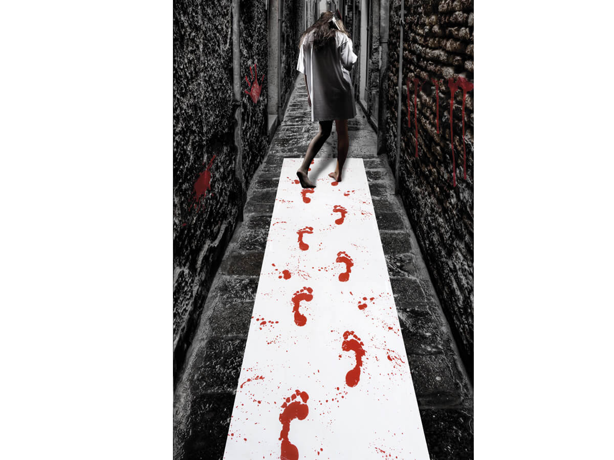 Covor alb cu urme de picioare pătate de sânge - 450 cm.