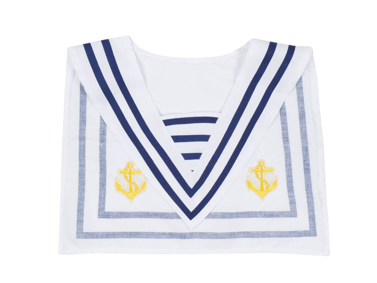 Descoperă accesoriul perfect pentru ținuta ta nautică! Guler de marinar în culorile clasice albastru și alb, decorate cu ancore aurii elegante, vor adăuga o notă autentică oricărei ținute. Dimensiunea universală asigură confort și o potrivire perfectă, astfel încât gulerul se va potrivi aproape oricui. Pe spate, gulerul măsoară 32 cm x 39 cm, în timp ce lungimea piesei triunghiulare este de 30 cm, ceea ce îl face ideal atât pentru adulți, cât și pentru copiii mai mari.
