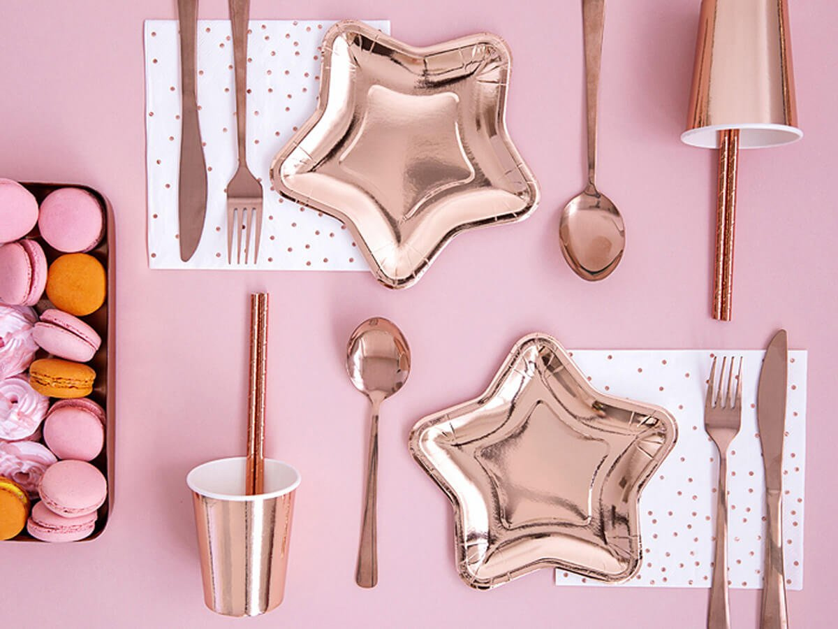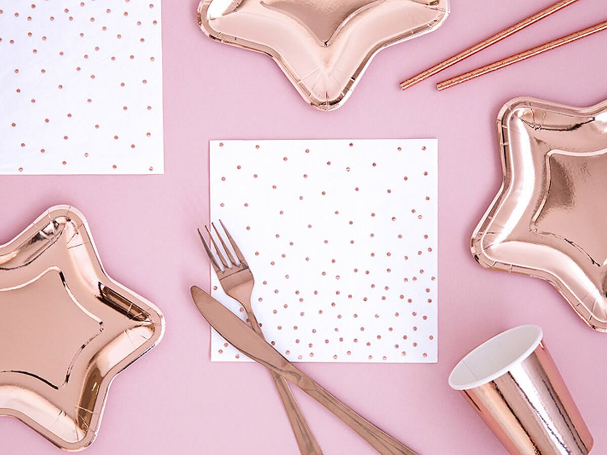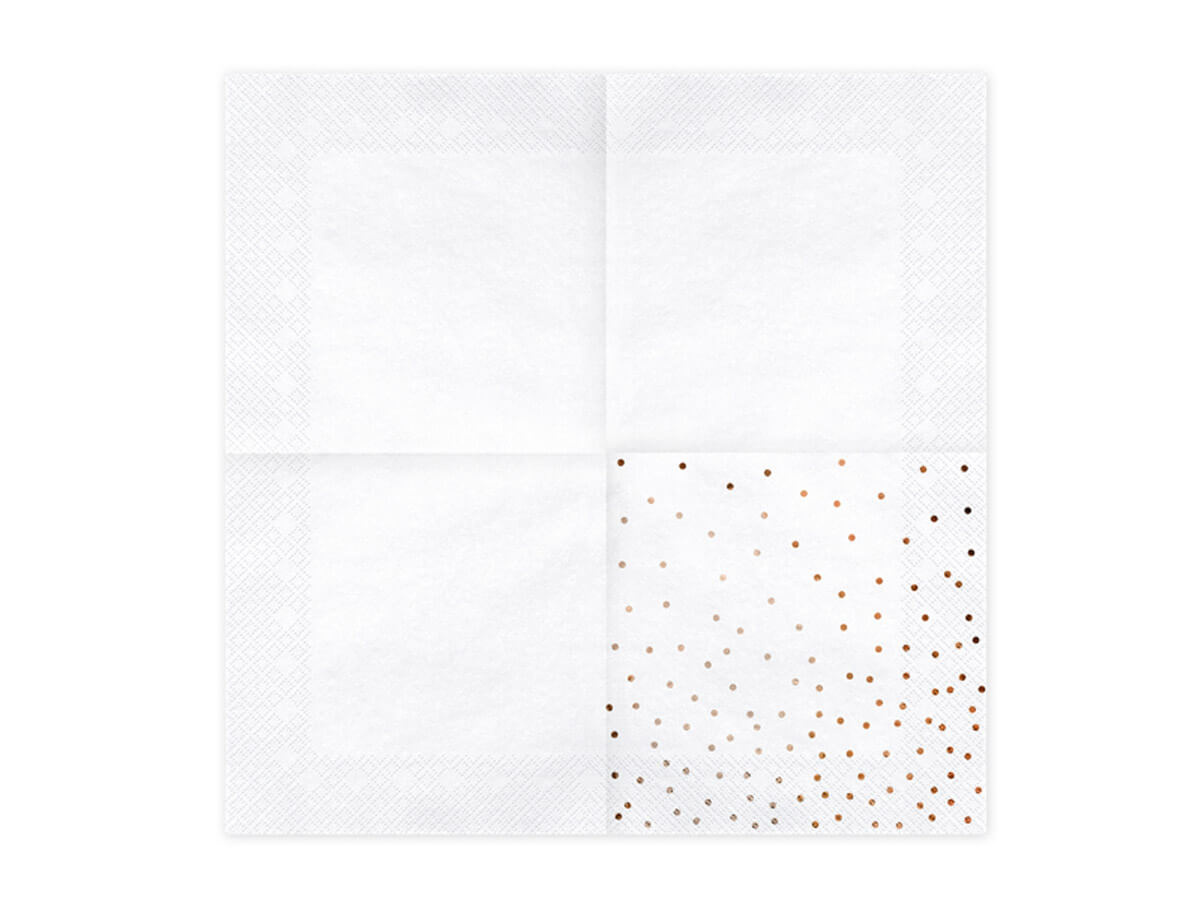 Șervețelele noastre sunt unice cu modelul lor sofisticat de puncte mici în aur roz pe un fundal alb. Dimensiunea de 33 cm x 33 cm (atunci când sunt desfăcute) le face ideale pentru servirea gustărilor, deserturilor sau pentru utilizarea ca fețe de masă. Există 20 de bucăți într-un pachet, ceea ce este suficient pentru majoritatea evenimentelor.