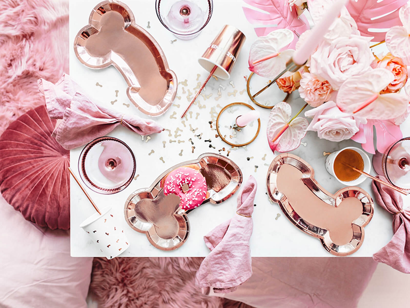 Organizarea petrecerii perfecte a burlăcițelor tocmai a devenit mai ușoară cu farfuriile noastre aurite în formă de penis! Aceste farfurii amuzante măsoară 26,5 cm x 15,5 cm și sunt din aur roz, fiind atât amuzante, cât și elegante - o combinație care nu poate fi întrecută! Cu siguranță vă vor face invitații să râdă și să se simtă confortabil cu forma lor unică. Fiecare pachet conține șase plăci la un preț accesibil care nu va rupe banca. Așa că nu ezitați să cumpărați aceste farfurii luminoase pentru a adăuga puțină distracție sărbătorii dvs!