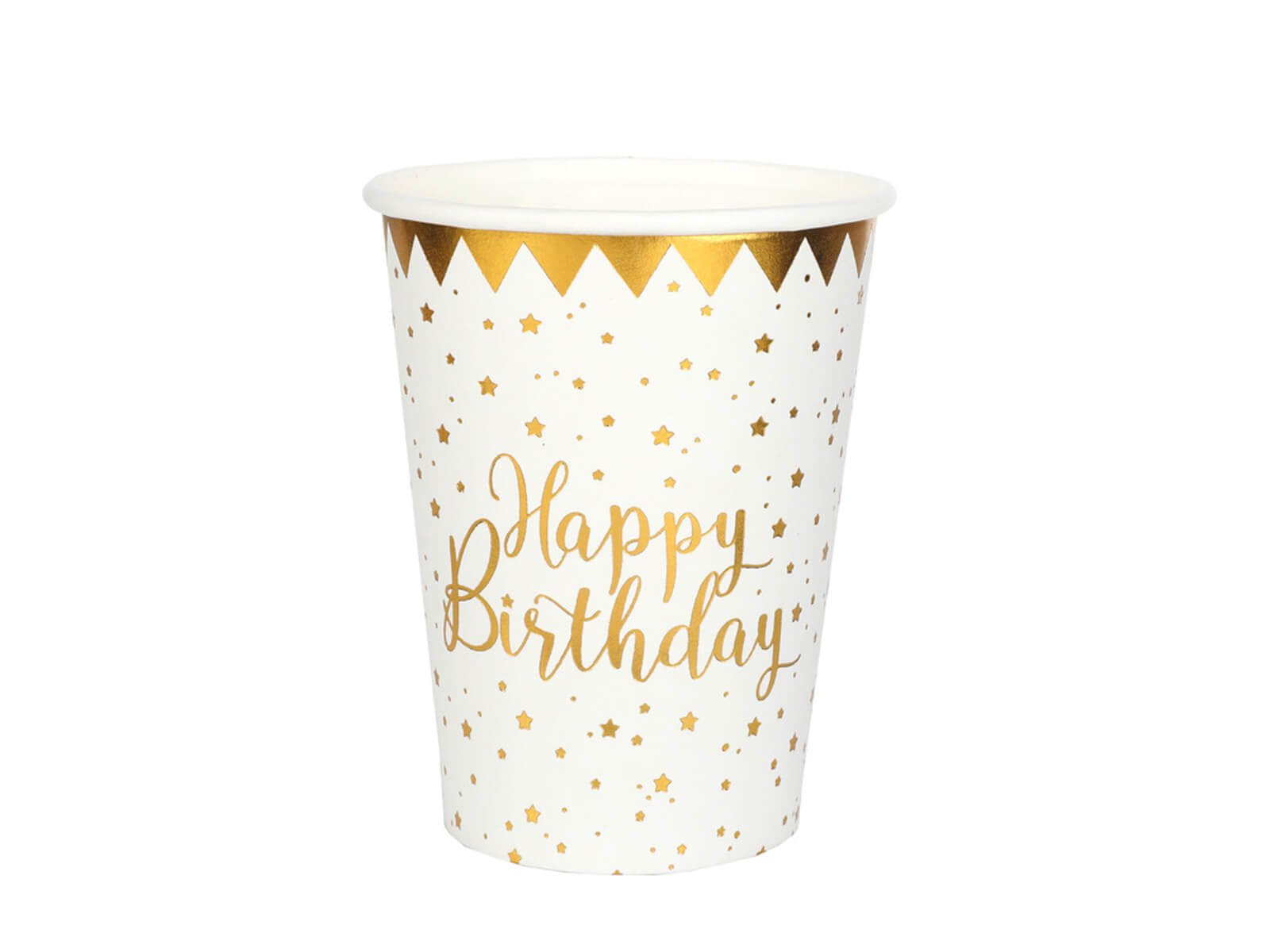 Descoperiți cupele noastre Happy Birthday - perfecte pentru orice petrecere! Realizate din materiale de înaltă calitate, aceste cupe albe sunt decorate cu inscripția "La mulți ani" metalizată cu aur, adăugând o notă elegantă și unică. Fiecare pachet conține 10 bucăți de 250 ml - ideal pentru servirea băuturilor preferate ale oaspeților.