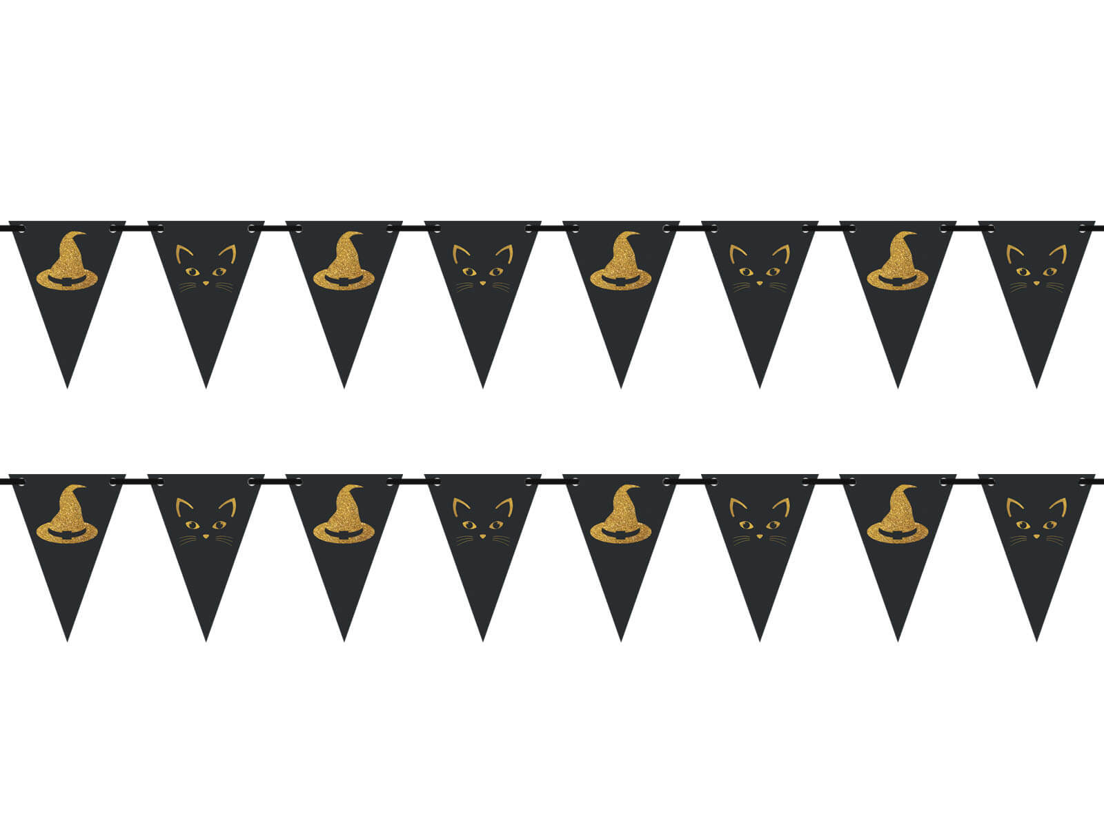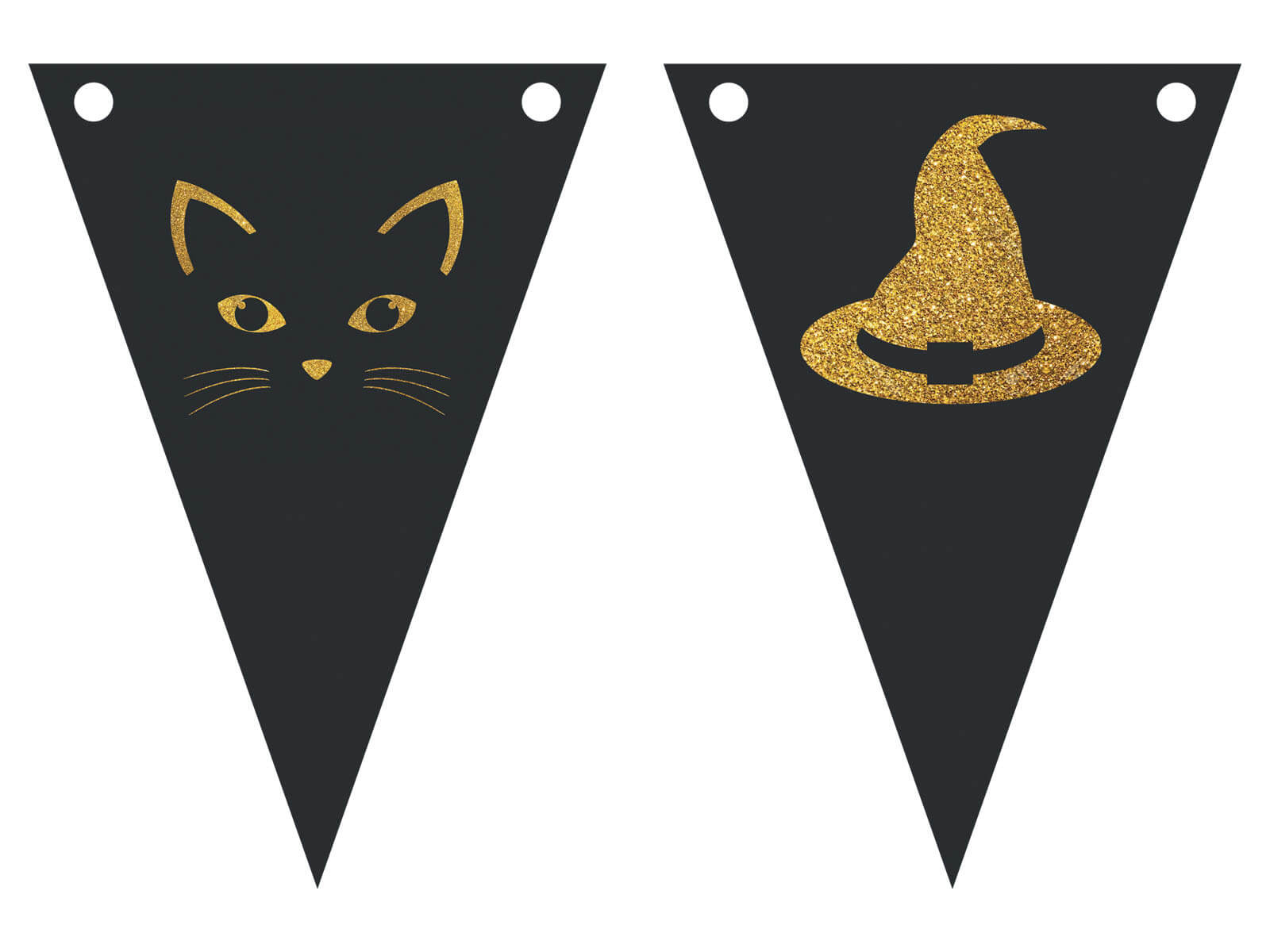 Transformați-vă festivitățile de Halloween într-o experiență de neuitat cu banner de Halloween cu un motiv de Vrăjitoarea și pisica. Această ghirlandă fermecătoare constă din 14 stegulețe, fiecare de 15 cm înălțime, care, combinate cu o panglică neagră elegantă, creează o atmosferă magică pentru orice spațiu. Lungimea panglicii este la fel de lungă ca 500 cm, care permite chiar și decorarea spațiilor mari.