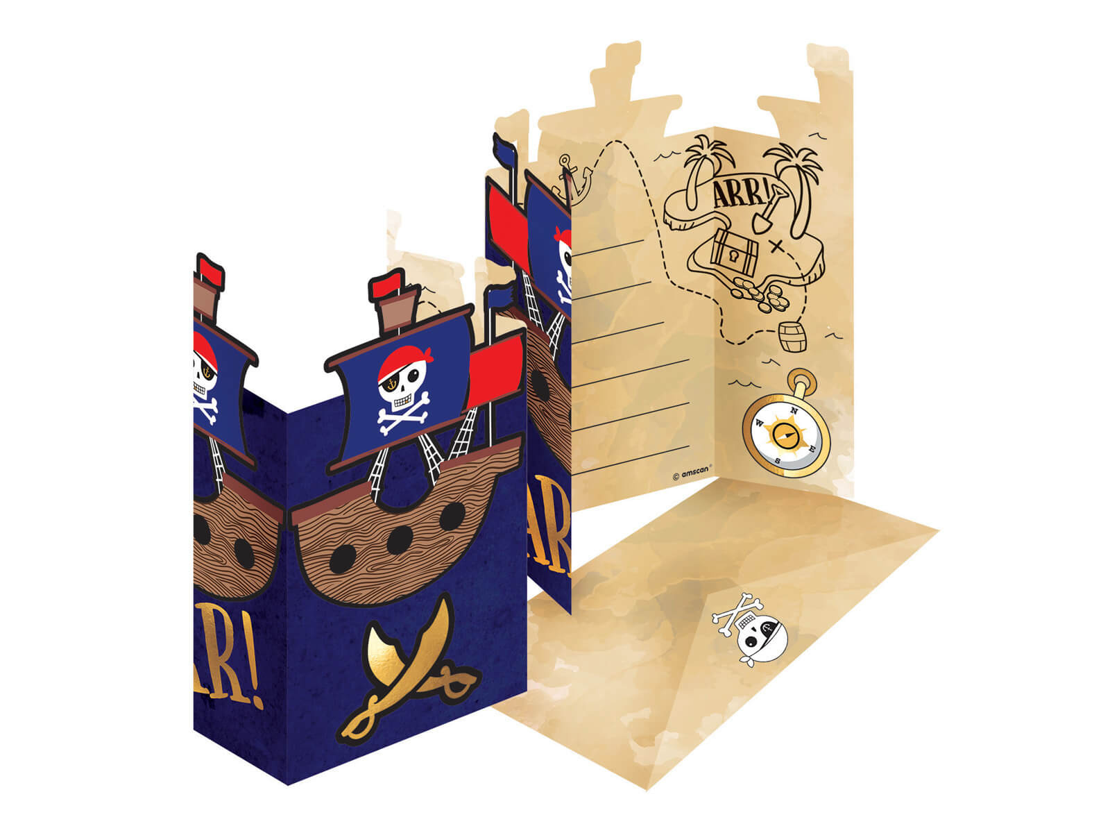 Set practic: În set primiți 8 invitații și plicuri care măsoară 22 x 13 cm. Toate sunt perfecte pentru o petrecere aniversară pentru copii sau adulți iubitori de aventuri pirat.
