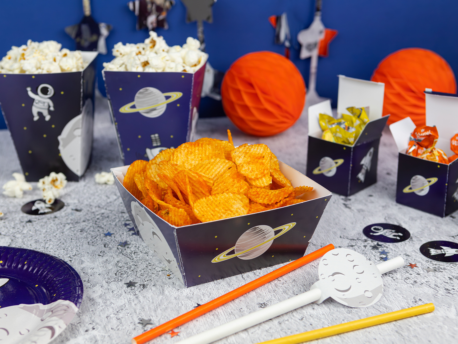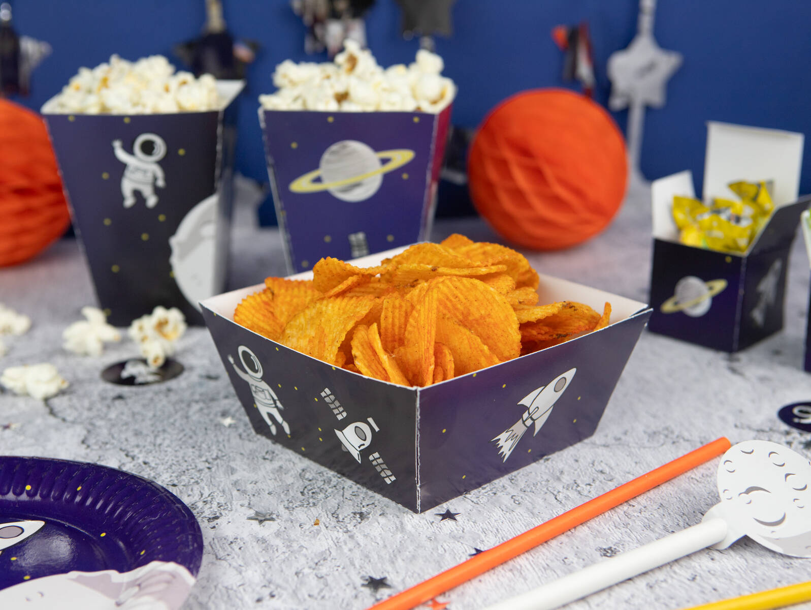 Vă prezentăm propriile noastre cutii de chipsuri Cosmos pentru o experiență culinară unică și memorabilă! Micile noastre cutii de hârtie adorabile au ca temă kitul aniversar Cosmos, astfel încât invitații dvs. vor fi încântați de designul lor drăguț. Ambalate 4 pe pachet, aceste cutii sunt ideale pentru depozitarea tuturor tipurilor de chipsuri, popcorn și alte dulciuri noi. Fiecare cutie măsoară 10cm x 10cm baza și 6cm înălțime și are o margine superioară de 13x13cm, oferindu-vă o mulțime de spațiu de depozitare!