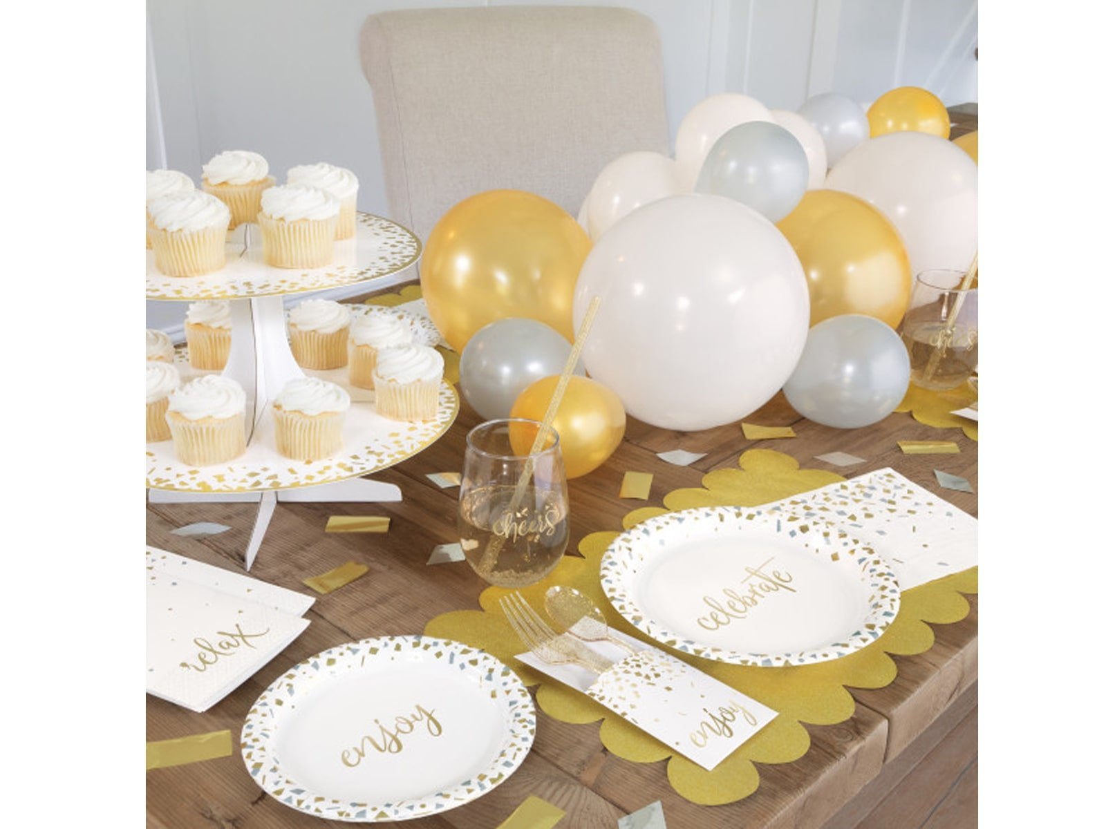 Suportul nostru pentru bomboane combină un fundal alb cu un imprimeu auriu izbitor, care va fi un decor minunat pe masa aniversară. Fabricat din carton, este ușor, stabil și ușor de asamblat.
