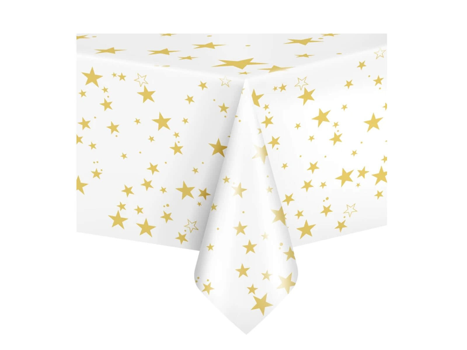 Față de masă aniversară albă cu stele aurii - 137 x 274 cm - 1 buc.
