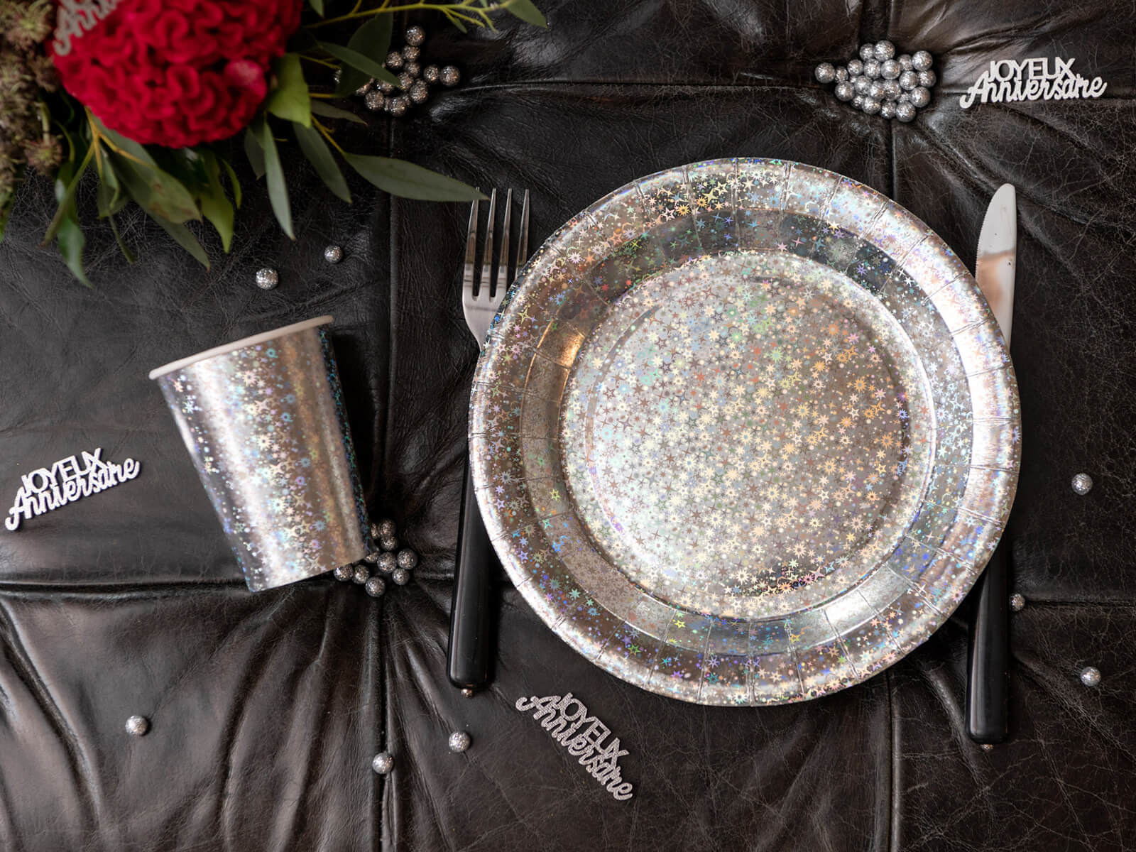 Dacă doriți să adăugați puțină strălucire ocaziei dvs. speciale, răsfățați-vă pe dvs. și pe invitații dvs. cu aceste pahare de hârtie argintii uimitoare! Cu un imprimeu holografic cu stele, puteți fi siguri că sărbătoarea va ajunge la stele. Fie că este vorba de o petrecere aniversară, petrecerea burlăcițelor sau Revelionul, aceste căni strălucitoare sunt perfecte pentru a adăuga o notă de farmec. Cu o capacitate de 270 ml, fiecare va conține toate băuturile dvs. preferate. În plus, cu 10 bucăți în fiecare pachet, vă sunt garantate suficiente căni! Dacă doriți să găzduiți o sărbătoare memorabilă, asigurați-vă că aduceți aceste pahare de hârtie argintii superbe - acestea vor adăuga ceva special și vor face orice ocazie memorabilă!