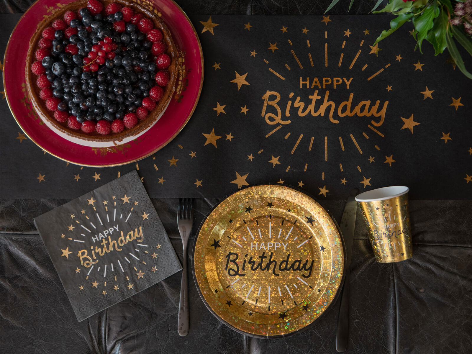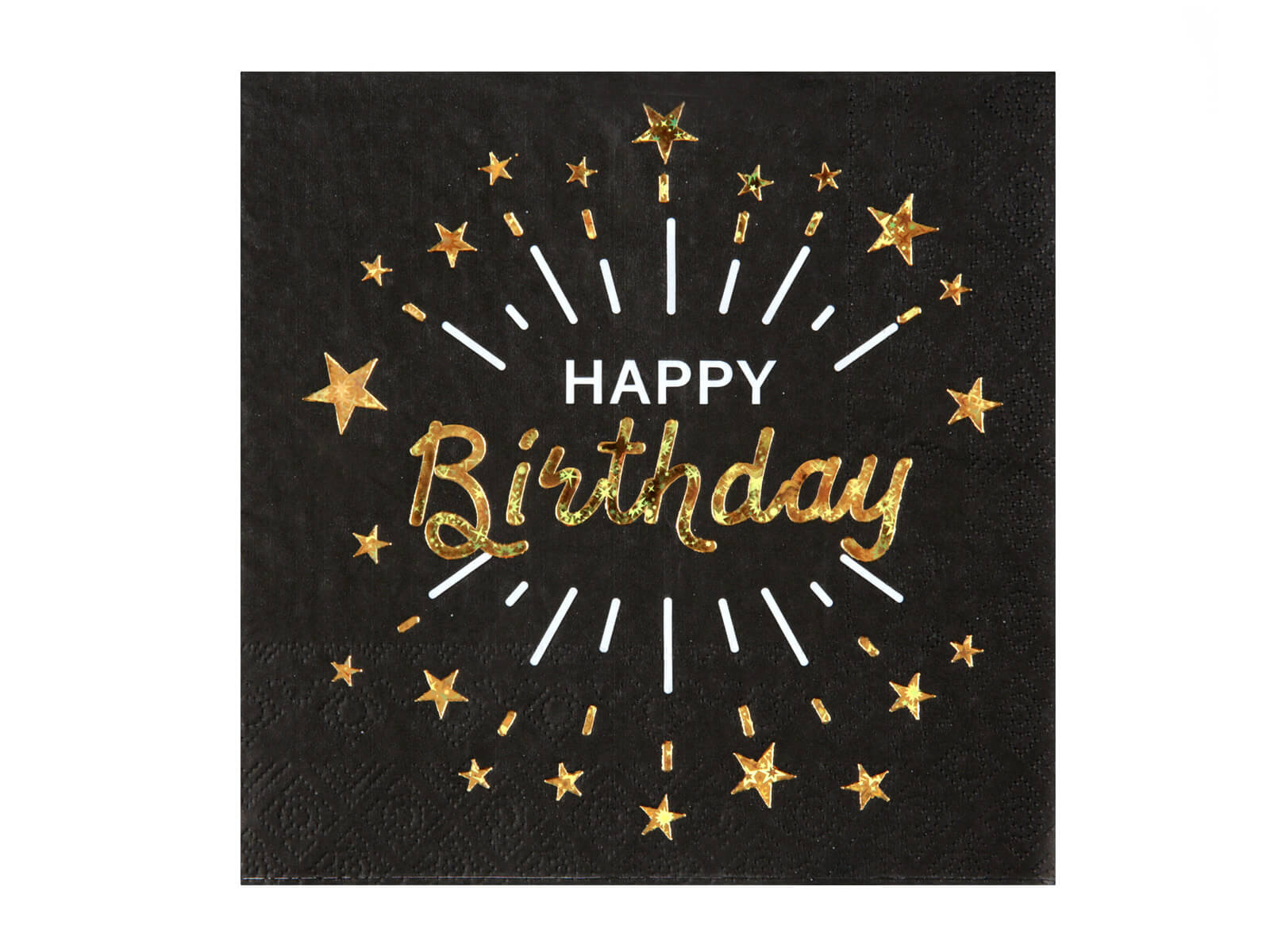 Șervețele Happy Birthday - negru cu litere albe și aurii