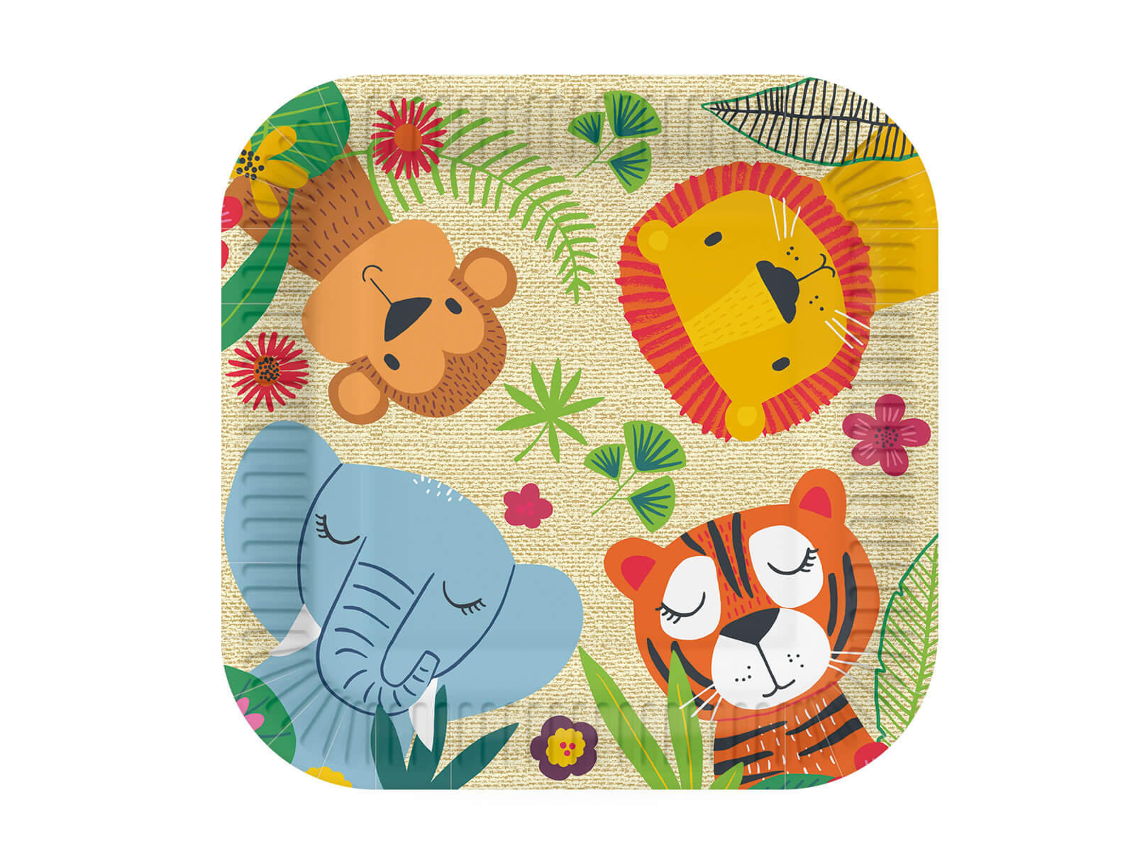 Descoperiți uimitoarele noastre farfurii Safari Animal, perfecte pentru petrecerea aniversară a copilului dvs. cu o temă exotică de expediție! Transportă-ți micuțul și prietenii într-o lume aventuroasă, unde vor fi însoțiți de animale adorabile - o maimuță, un leu, un elefant și un tigru. Veți găsi toate aceste personaje adorabile pe farfuriile noastre de hârtie colorate!