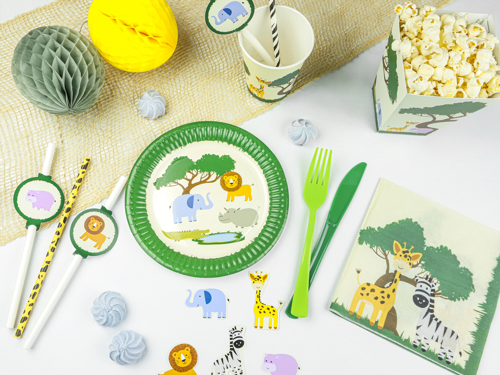 Setul de picnic Safari include 6 decorațiuni uimitoare care înfățișează animale precum leul, elefantul, girafa, zebra, rinocerul, hipopotamul și crocodilul. Fiecare a fost realizat cu atenție la cele mai mici detalii, făcându-le să pară extrem de realiste.
