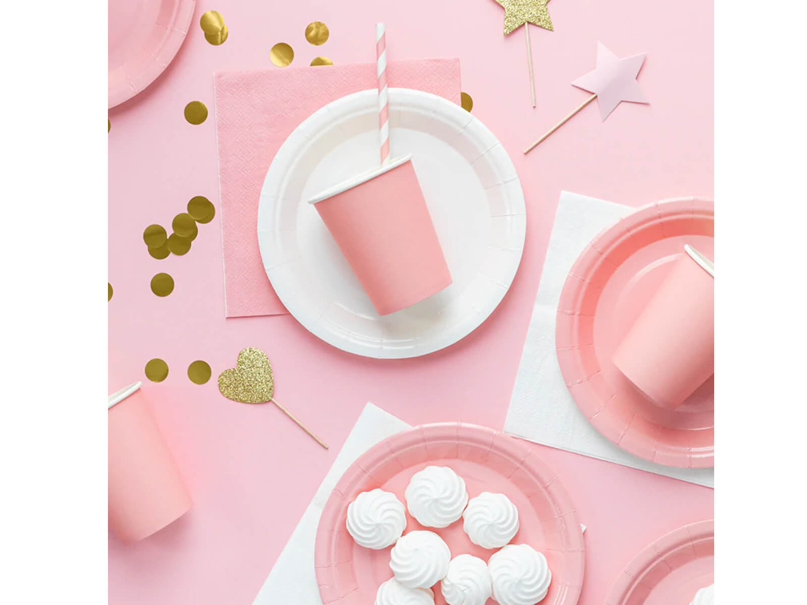 Paharele noastre de hârtie roz nu sunt doar practice, ci și frumoase. Nuanța lor moale de roz va adăuga farmec și eleganță oricărei petreceri. Este o completare perfectă pentru decorarea mesei dvs.