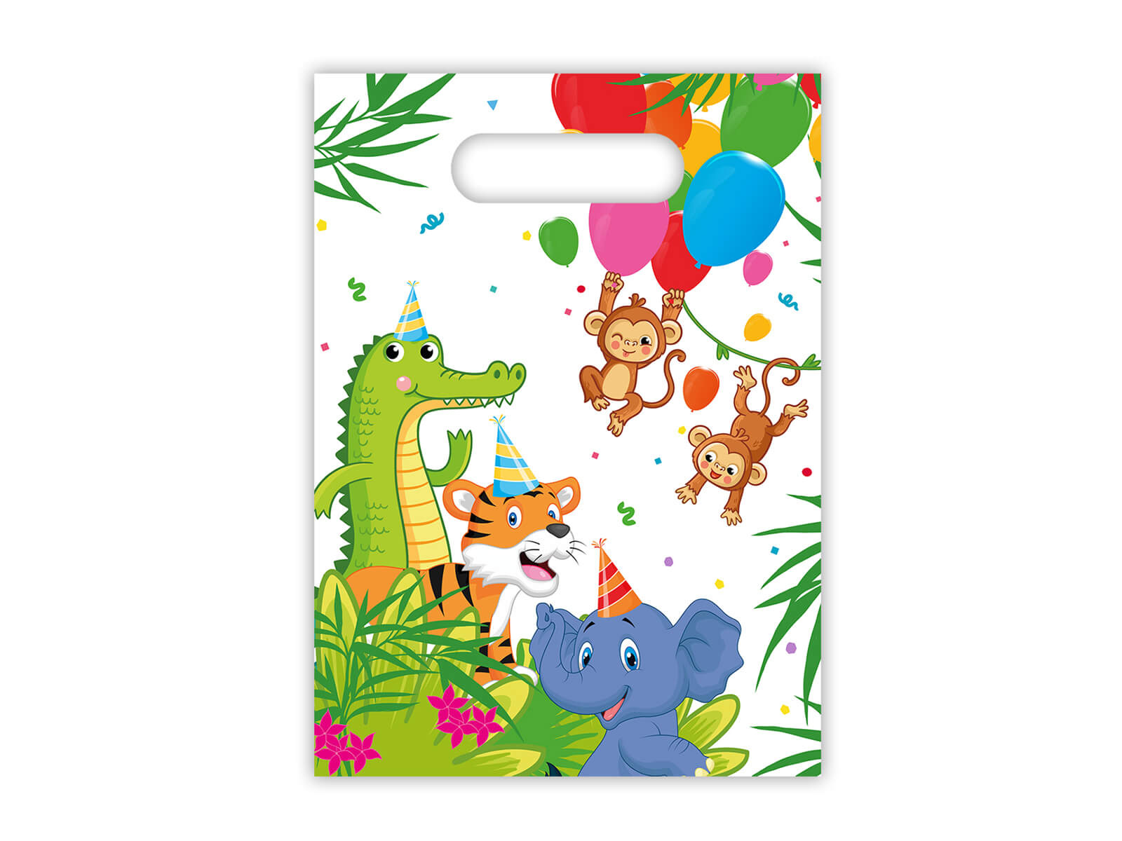 Ambalaje vesele pentru momente magice! Vă prezentăm un set de șase pungi cadou din folie cu un imprimeu animal adorabil. Cu ilustrații ale unui crocodil, tigru, elefant și maimuțe, aceste pungi colorate sunt perfecte pentru orice petrecere aniversară a copiilor, iar tema safari adaugă o notă unică.