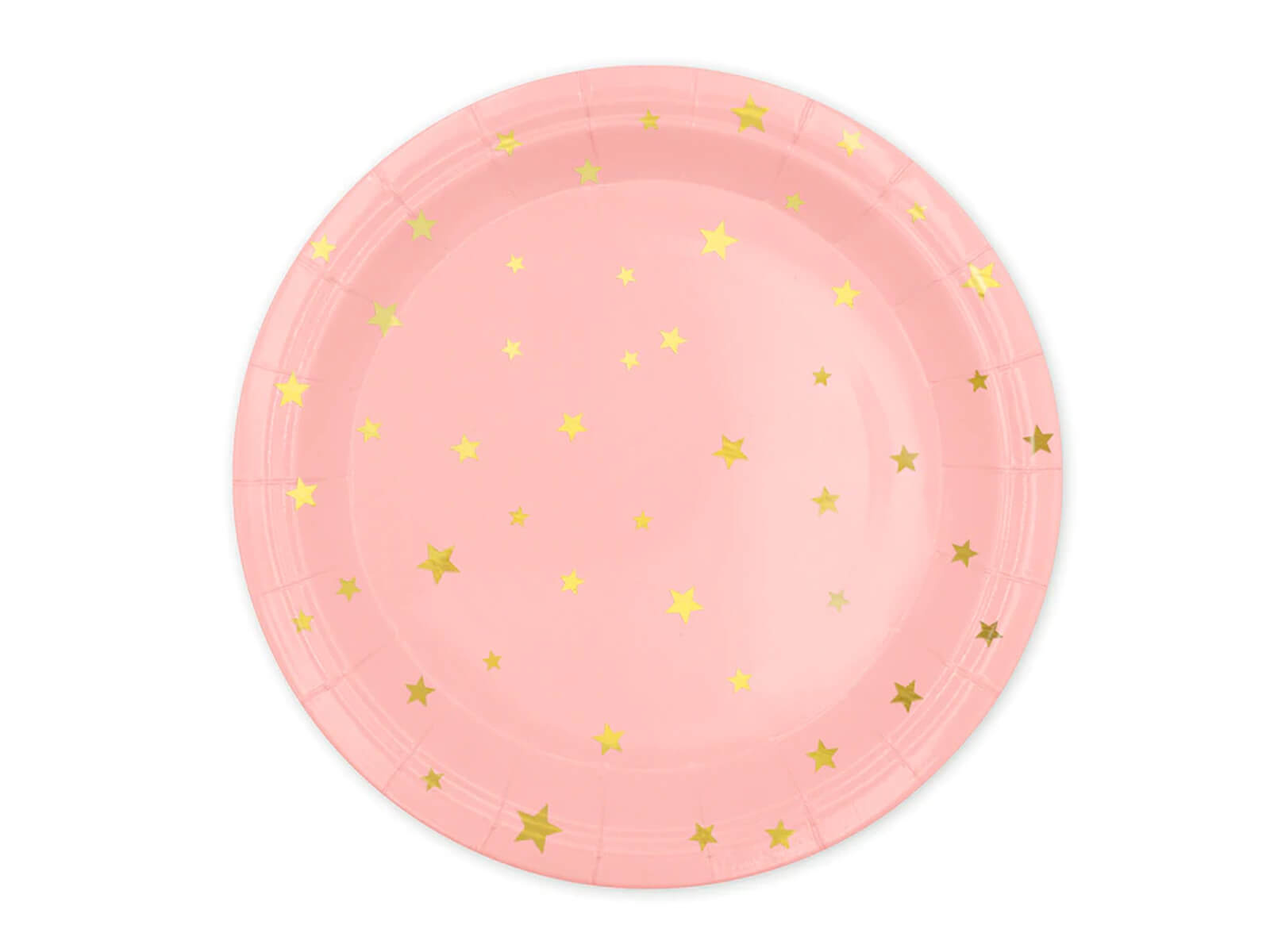 Farfurii de hârtie roz cu stele aurii - 23 cm - 6 buc.
