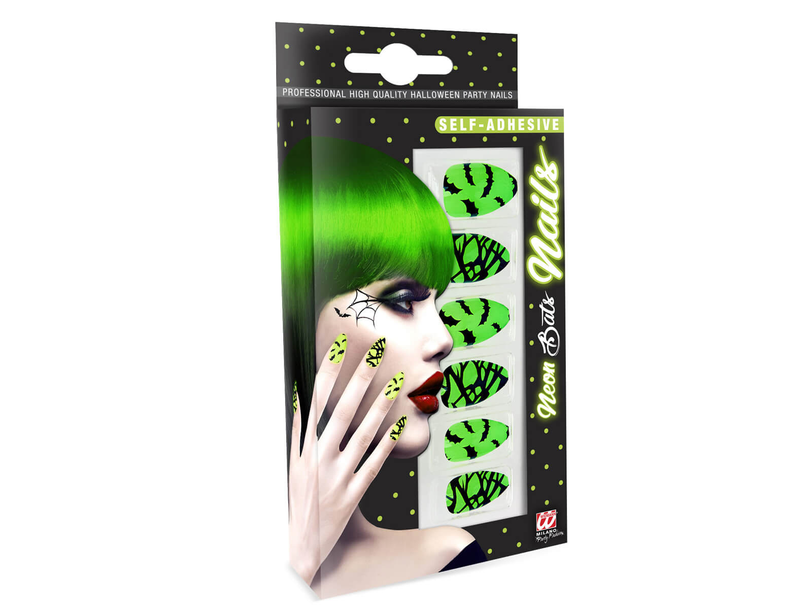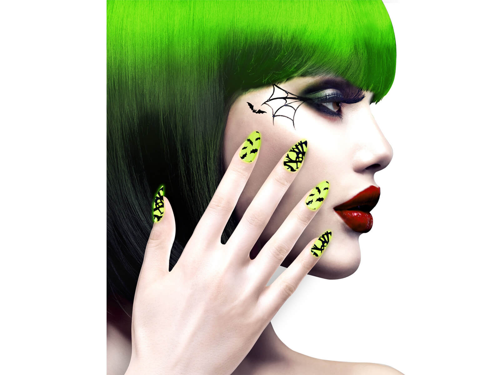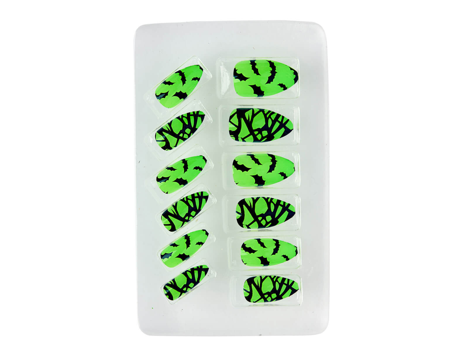 Uimitoare unghii false Bats faceți fiecare noapte de Halloween mai plăcută! Aceste unghii false autoadezive în tonuri orbitoare de verde neon cu un motiv de liliac sunt completarea perfectă pentru costumul tău. Le puteți aplica cu ușurință, transformându-vă mâinile într-o parte cu adevărat înfricoșătoare a deghizării dumneavoastră.