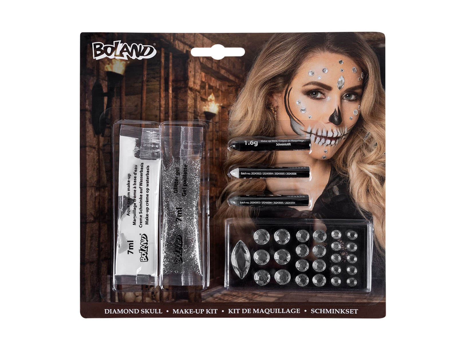 Transformă-te într-o pelerină cu diamante strălucitoare pentru viitorul Halloween sau Ziua lui Andrew! Trusa de machiaj Diamond Skull conține tot ce aveți nevoie pentru a crea un machiaj glamour, de neuitat. Setul include: