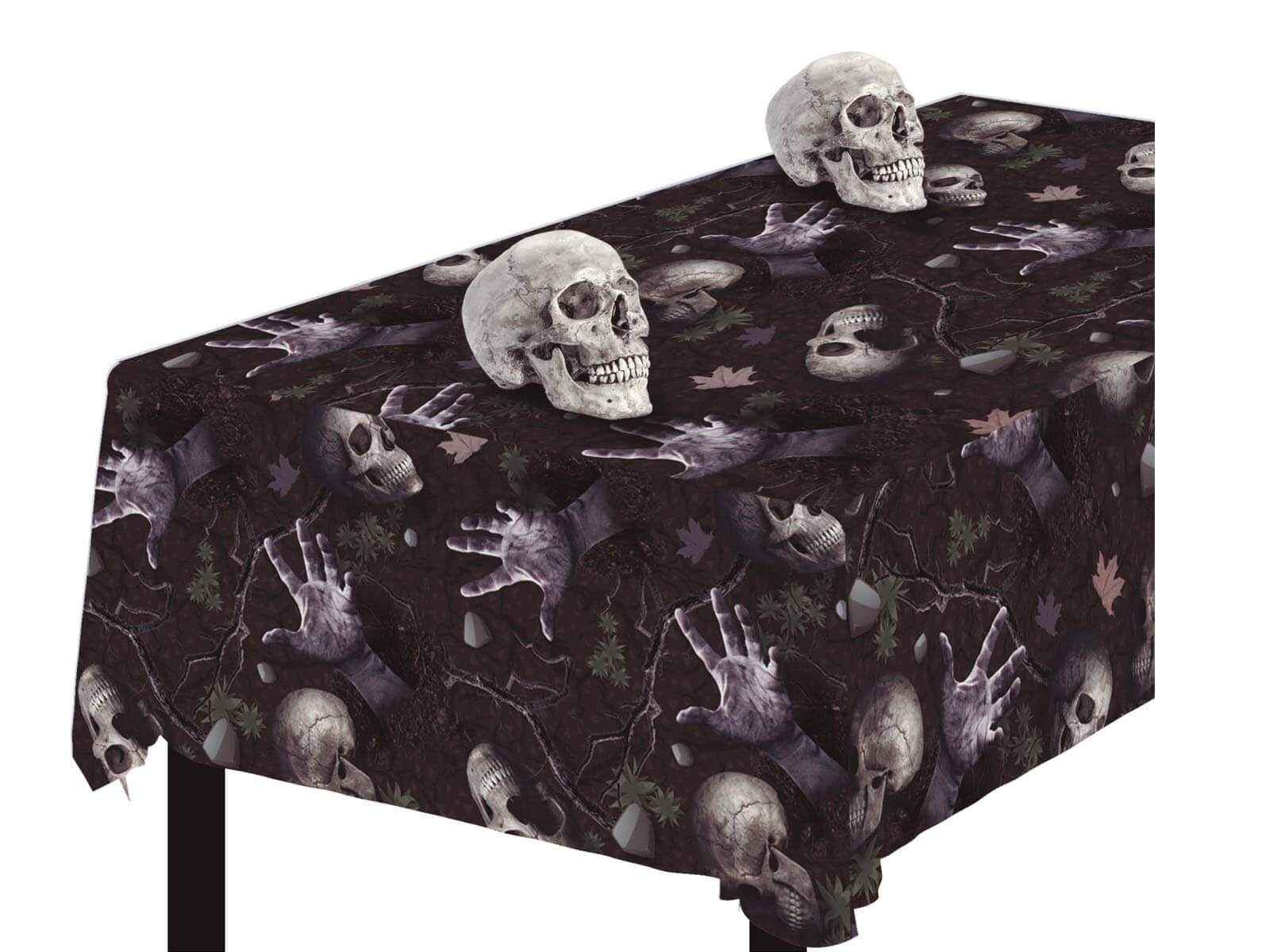 Fabricat din folie de înaltă calitate, nu este doar durabil, ci și ușor de curățat, ceea ce îl face alegerea perfectă pentru o petrecere de Halloween. Dar asta nu e tot. Fața de masă este decorată cu un imprimeu unic de cranii și mâini, care îi adaugă o notă unică, înfricoșător de elegantă.