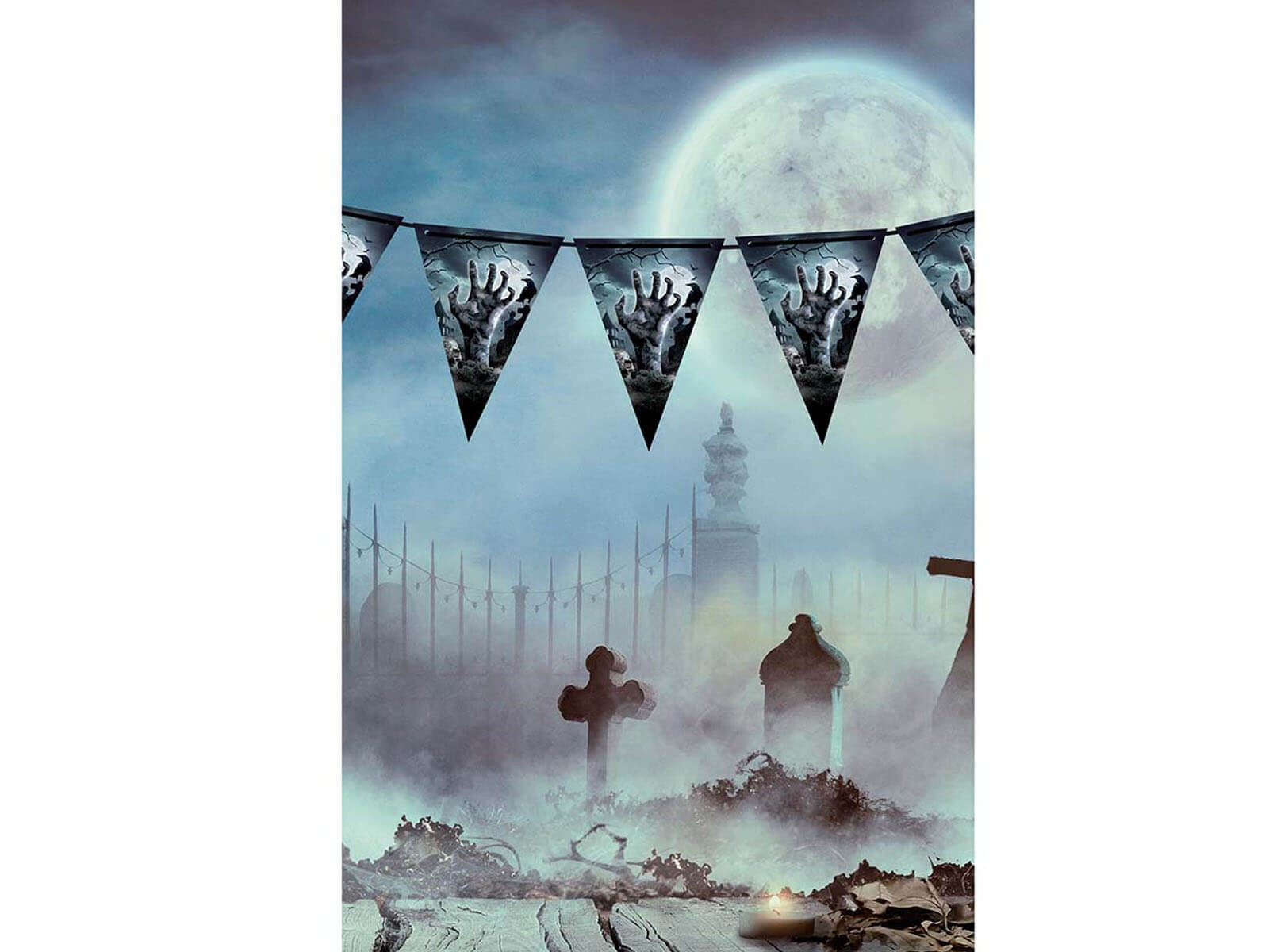 Transformați-vă spațiile într-un tărâm întunecat al strigoilor cu Steaguri zombie". Acesta este decorul de Halloween perfect pentru a vă pune toți oaspeții în starea de spirit înfricoșătoare potrivită. Bannerul este fabricat din folie, ceea ce garantează durabilitatea și ușurința de agățare. Fiecare steag este decorat cu o imprimare a unui cimitir întunecat, adăugând acea înfricoșare esențială la orice decor de Halloween.