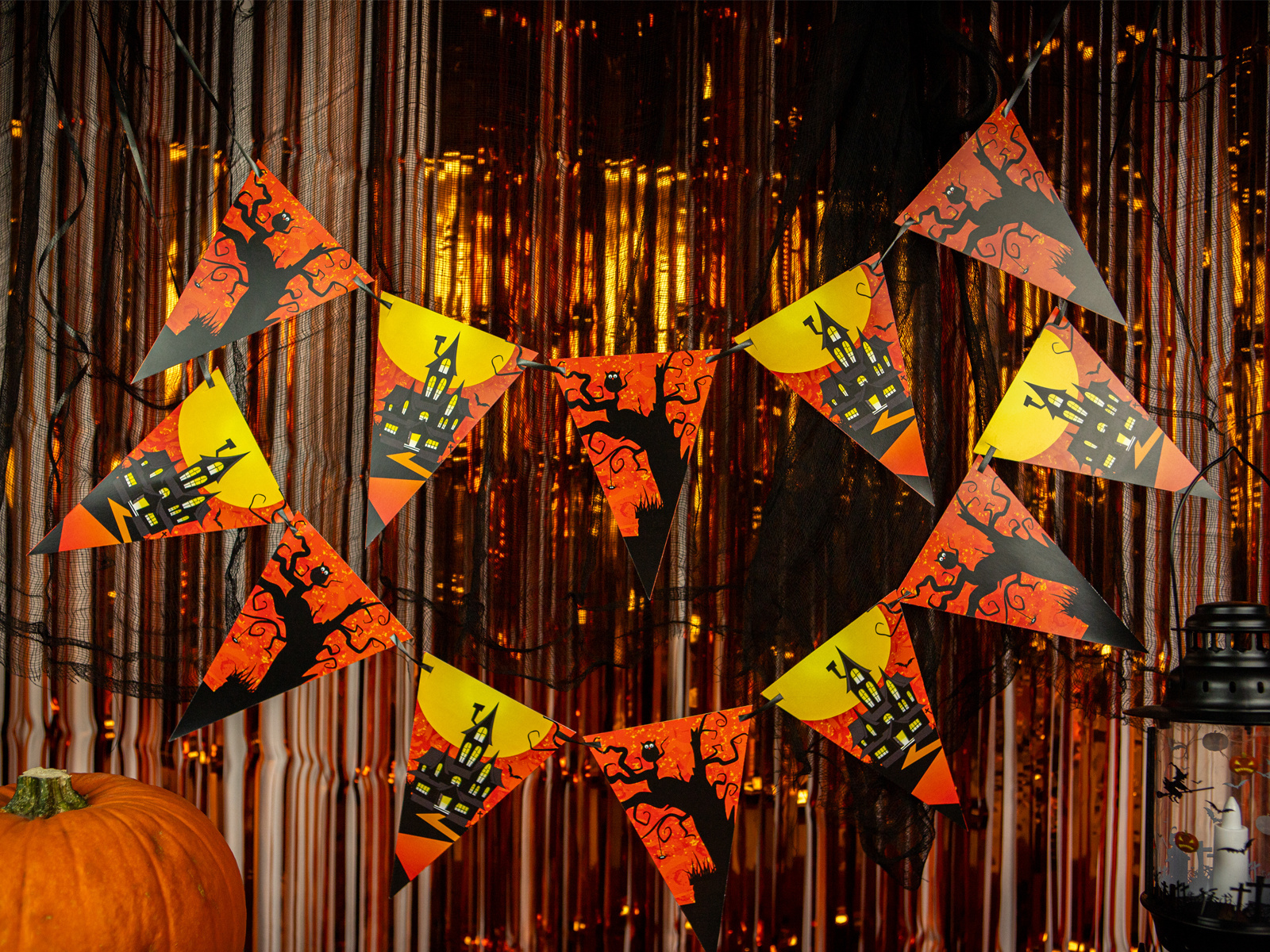 Setul include 14 steaguri, fiecare de 15 cm înălțime, care pot fi aranjate după dorință pentru a crea propria ghirlandă unică de până la 500 cm lungime. Alegerea perfectă pentru Halloween, pentru decorațiuni interioare și exterioare.