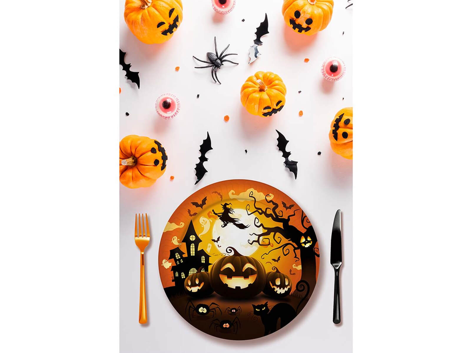 - Farfurii de hârtie cu un design extrem de atractiv de dovleac, vrăjitoare și casă bântuită