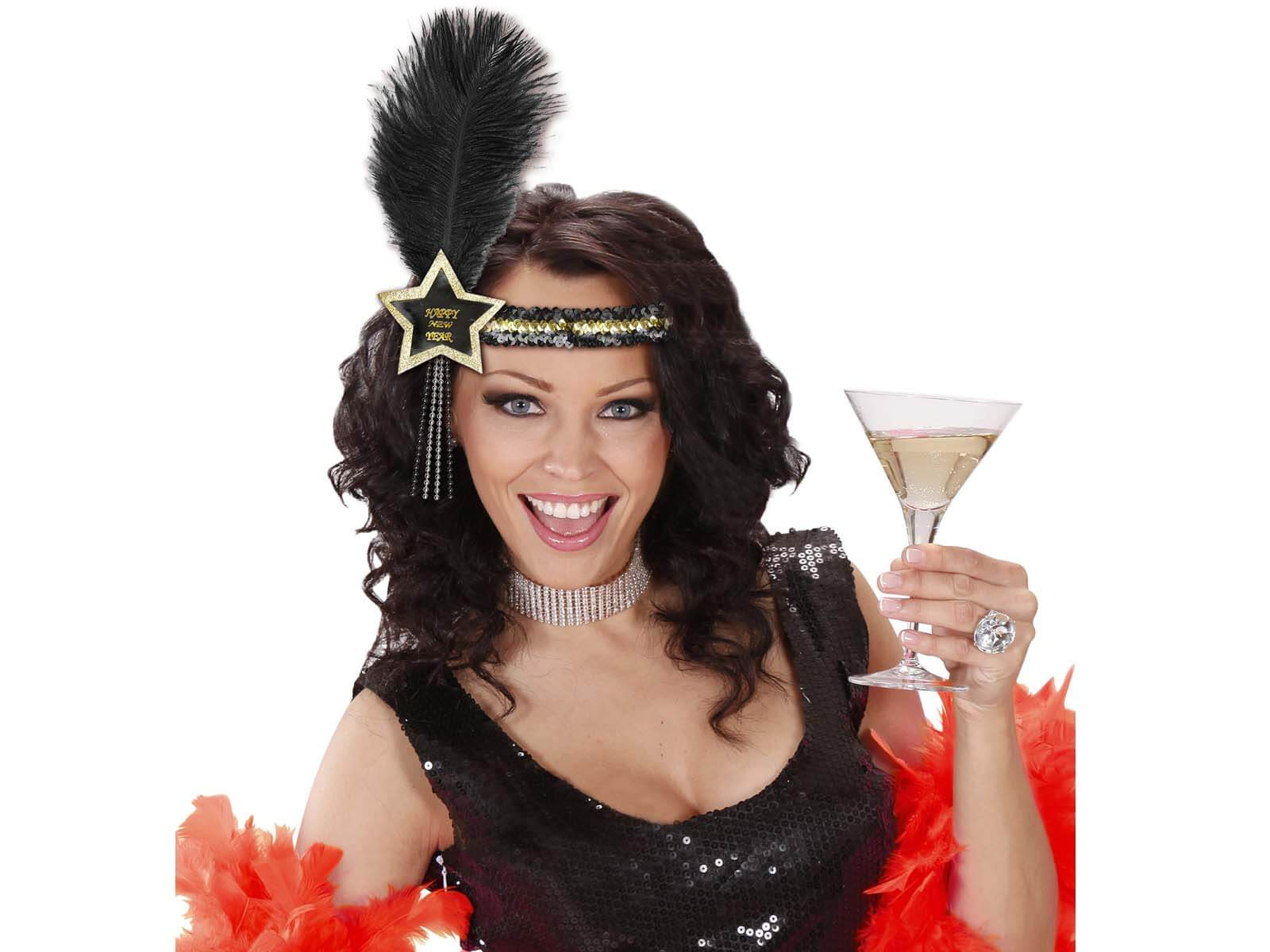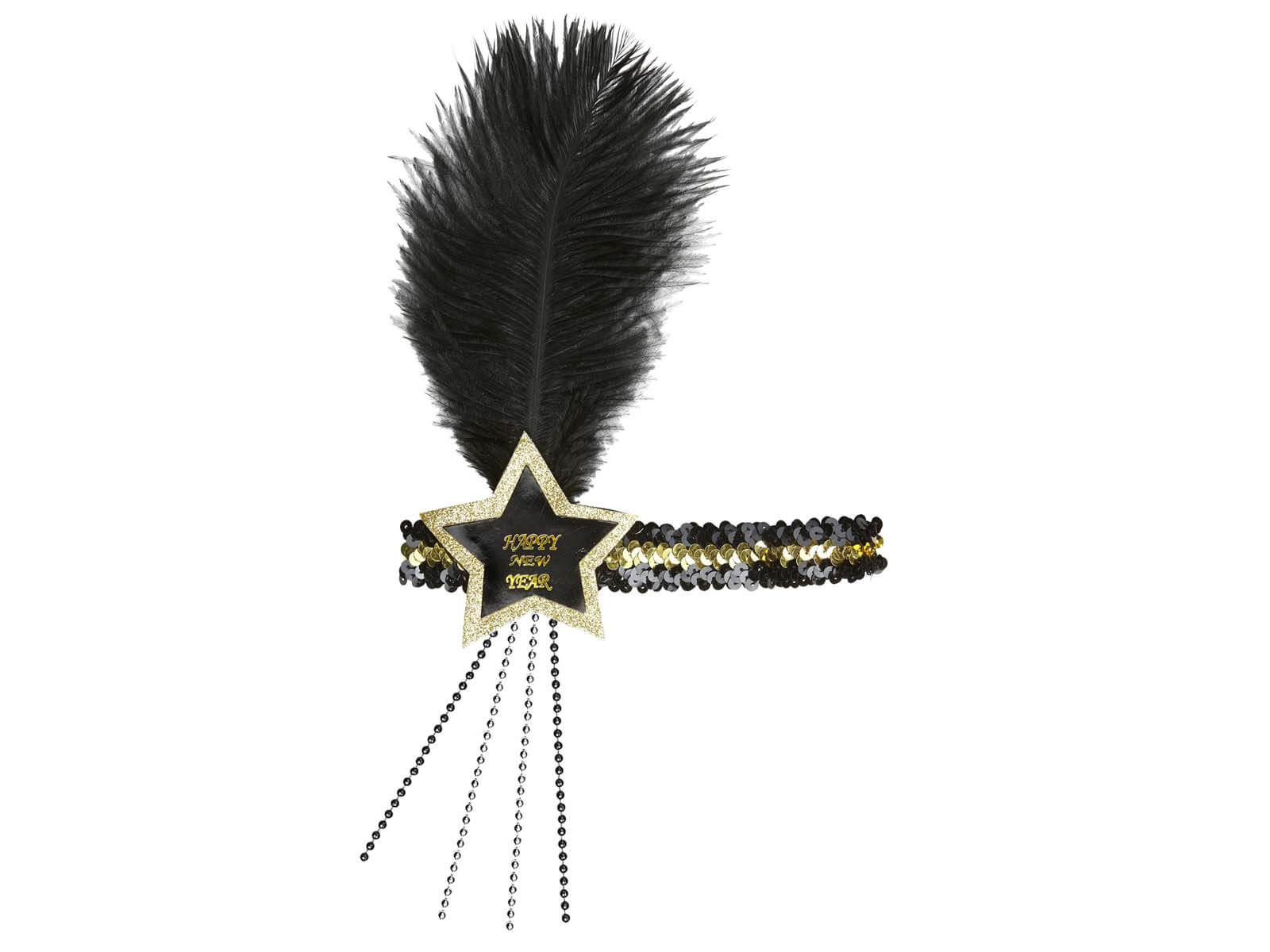 Bentiță cu pene de Anul Nou fericit în negru și auriu - 1 buc.