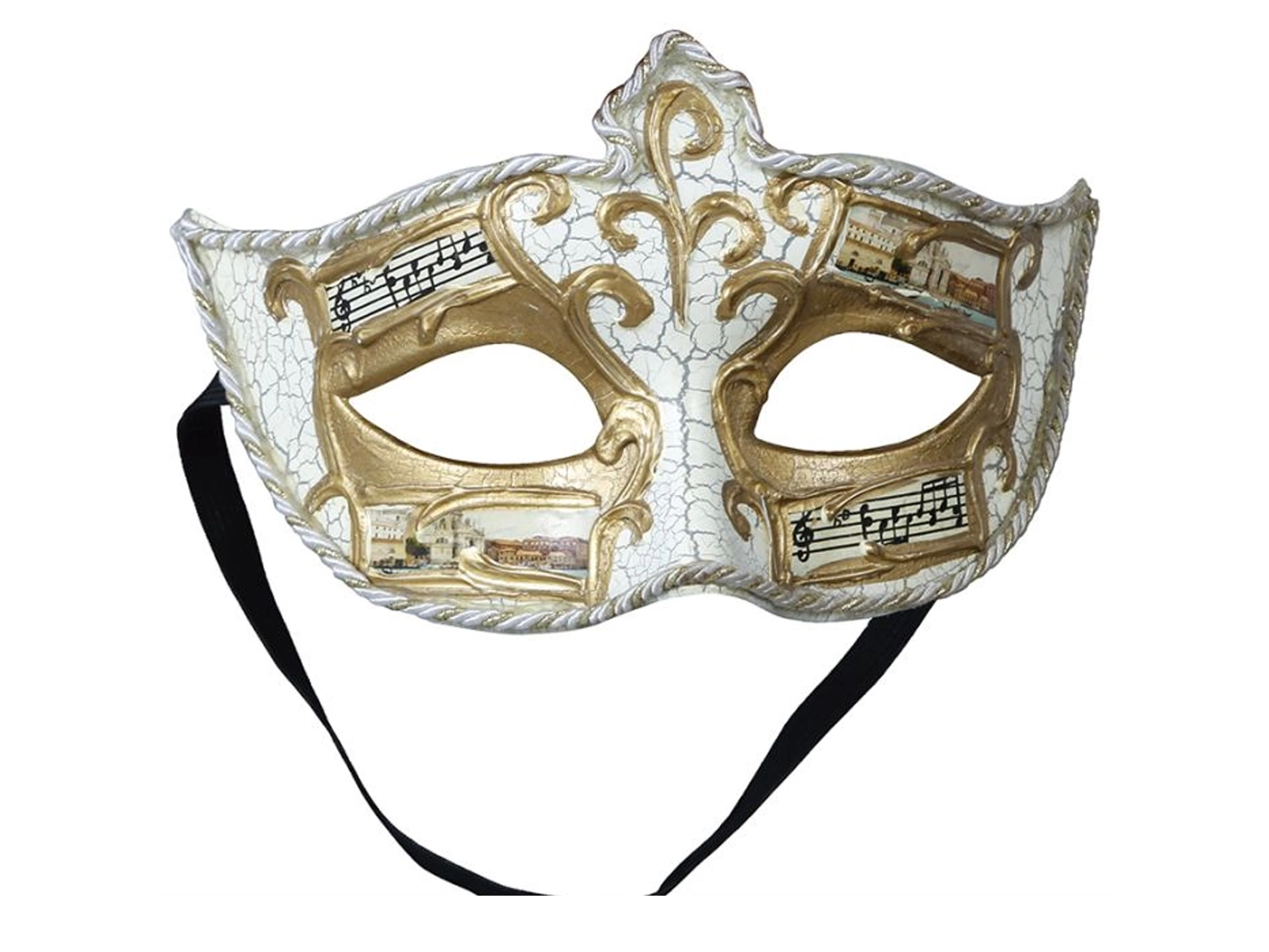 Descoperiți magia carnavalurilor venețiene tradiționale cu masca noastră exclusivistă de carnaval în alb și auriu, decorată cu motive muzicale elegante. Ideal pentru toate tipurile de sărbători, de la Ajunul Anului Nou după carnaval și ocazii speciale, cum ar fi o noapte a burlăcițelor.