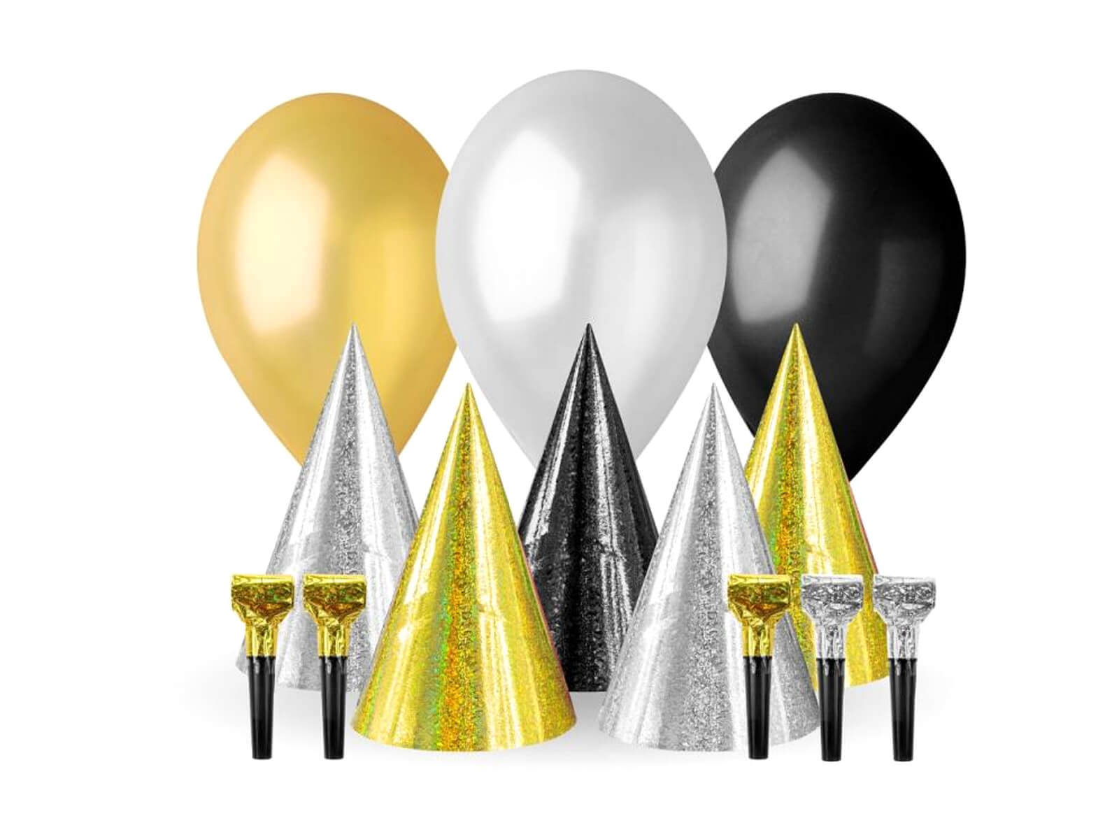 - 3 baloane din latex în auriu, negru și argintiu elegant.