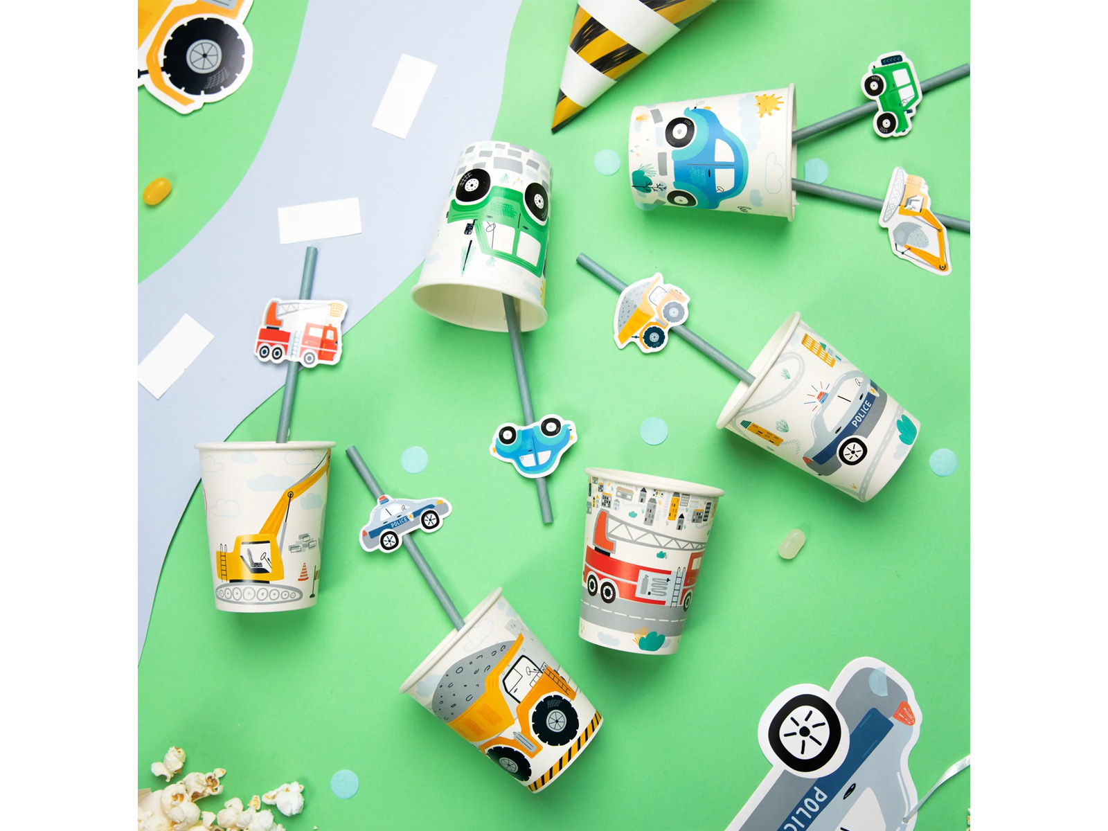 Pregătiți-vă pentru o călătorie interesantă la următoarea dvs. petrecere aniversară cu pahare de hârtie cu tema Cars! Cupele se vor potrivi perfect cu tema zilei de naștere a oricărui mic fan al vehiculelor. Setul include șase modele diferite reprezentând un Jeep, un cocoșat, o mașină de pompieri, o mașină de poliție, o basculantă și un excavator, care va încânta cu siguranță orice copil.