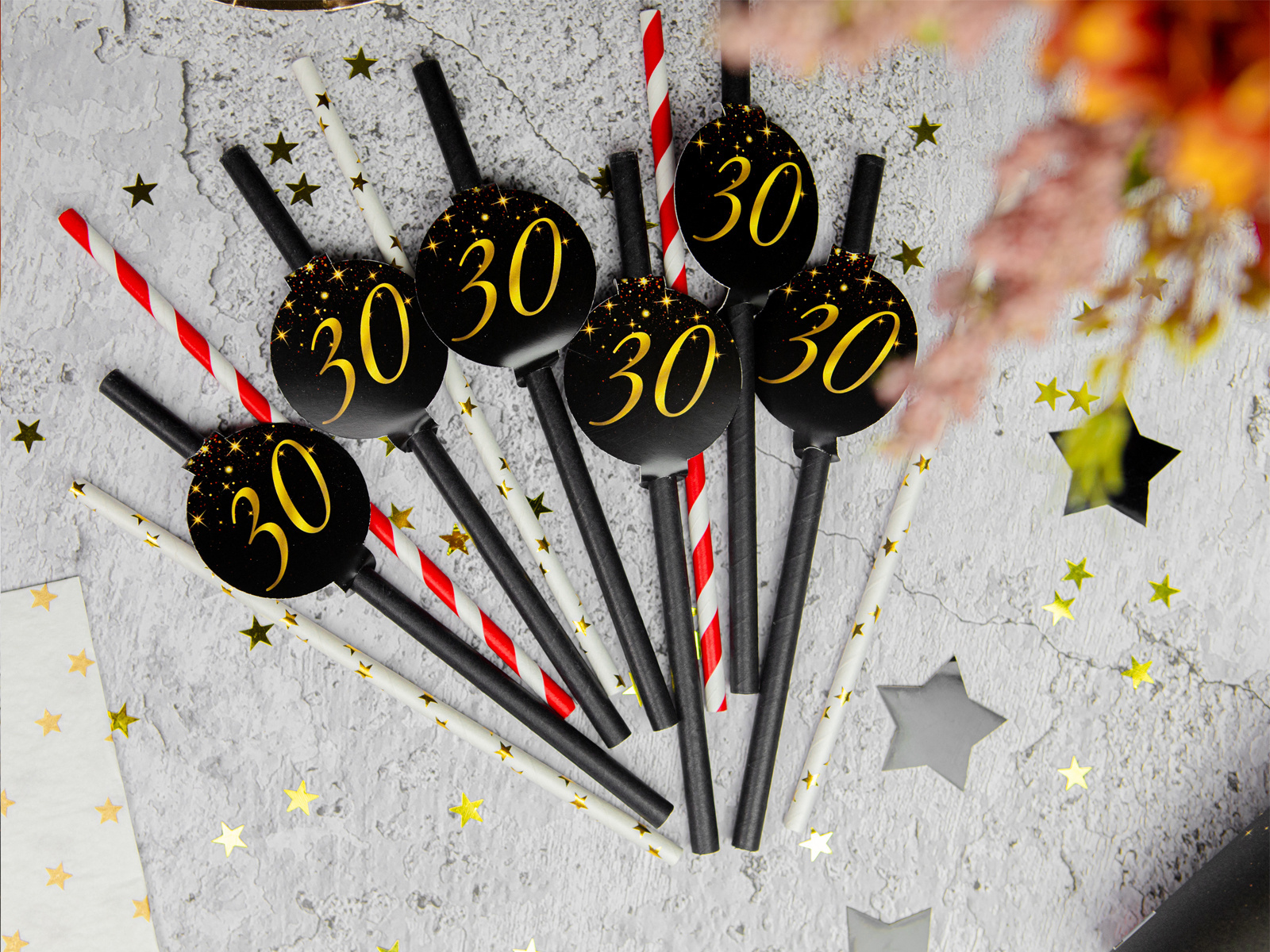 Vă sărbătoriți cea de-a 30-a aniversare? Ridicați un toast cu clasă cu paiele exclusive paie negre spumante! Aceste paie elegante nu sunt doar un accent decorativ deosebit, ci și o alegere ecologică, datorită biodegradabilității lor. Ideal pentru petreceri aniversare și alte ocazii speciale.