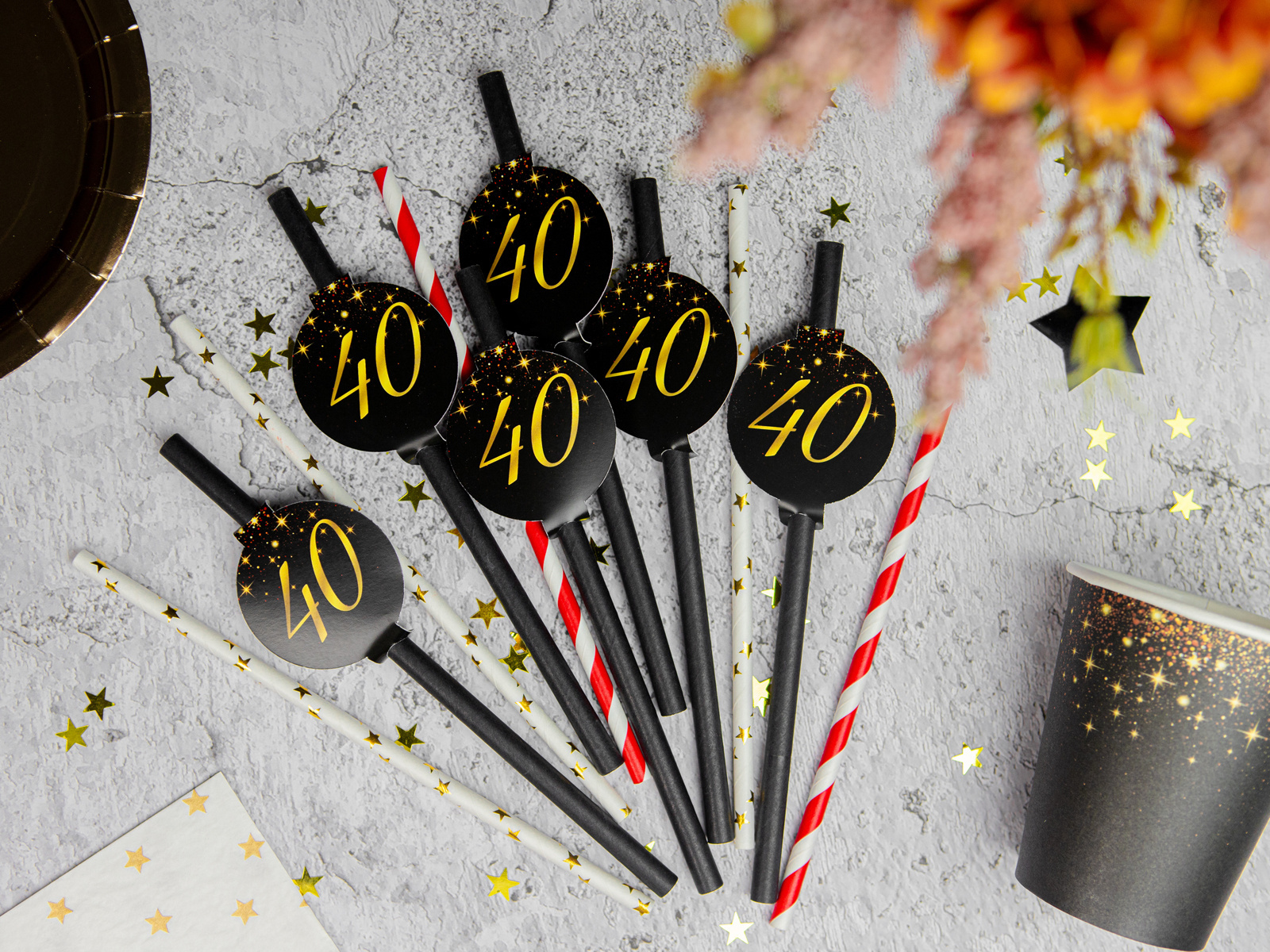 Subliniați unicitatea celei de-a 40-a aniversări cu aceste paie negre elegante de la Sparkling. Aceste paie simple și elegante sunt partenerul perfect pentru orice tip de băutură, de la cocktailuri clasice la băuturi răcoritoare cu efervescență. Fiecare set conține 6 biodegradabile paie, ceea ce le face o alegere practică și ecologică. Medalioanele decorative cu numărul "40" adaugă o notă unică fiecăruia, făcându-le centrul de masă perfect.