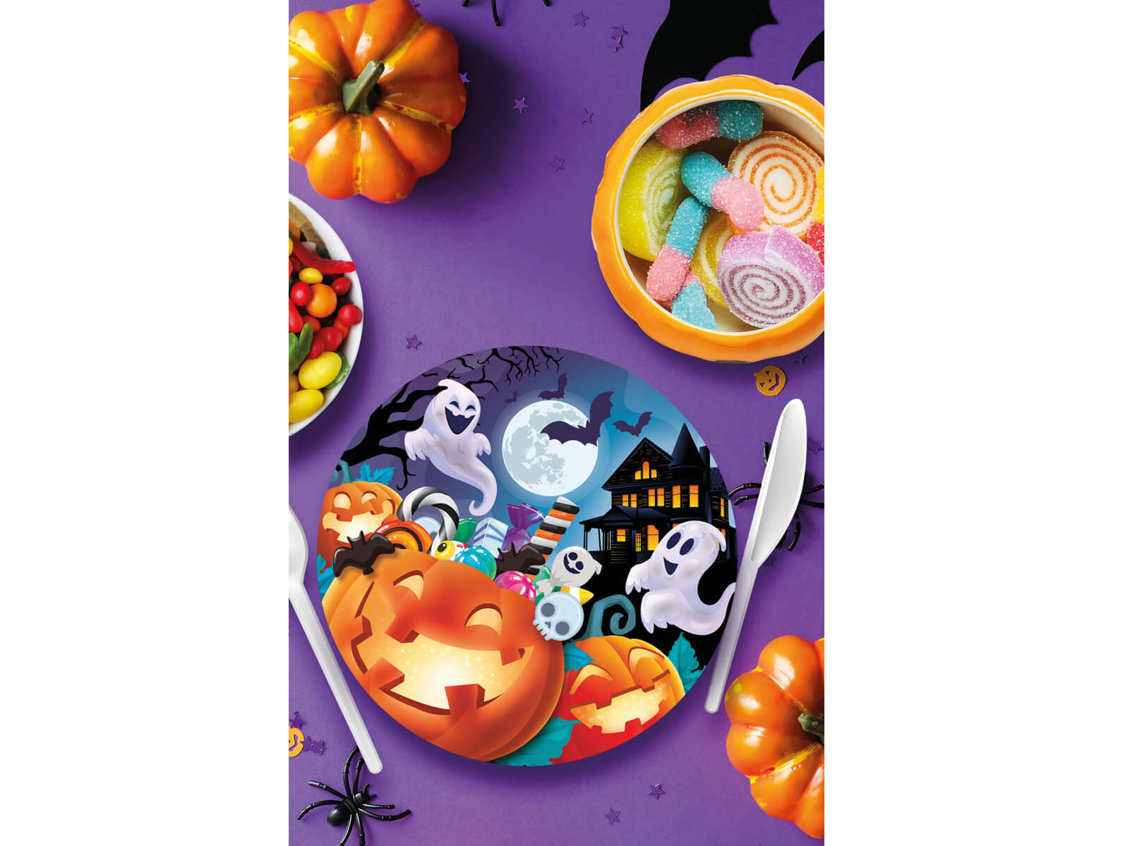 Pregătiți-vă pentru un Halloween de neuitat De Halloween cu farfuriile noastre colorate! Decorată cu motive de dovleci, fantome, lilieci și o casă bântuită, contribuie la atmosfera oricărei petreceri înfricoșătoare. Ideal pentru copii cărora le va plăcea să mănânce gustări din astfel de farfurii distractive. Diametrul fiecăruia este de 23 cm, ceea ce este ideal pentru a servi atât mâncăruri calde, cât și reci.