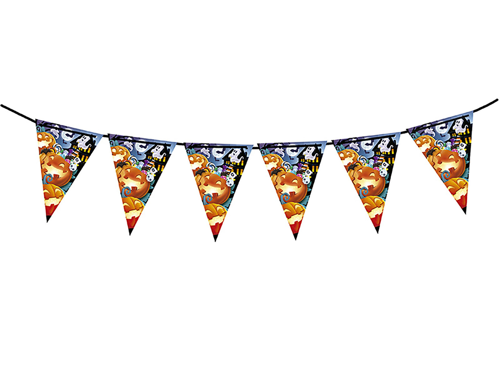 Transformați-vă camera într-o atmosferă plină de distracție înfricoșătoare cu bannerul nostru de hârtie "Halloween fericit". Această decorațiune unică constă din stegulețe de 19 x 27 cm, decorate cu motive colorate, cum ar fi dovleci, fantome, lilieci și case bântuite, pentru a crea o atmosferă cu adevărat de Halloween.