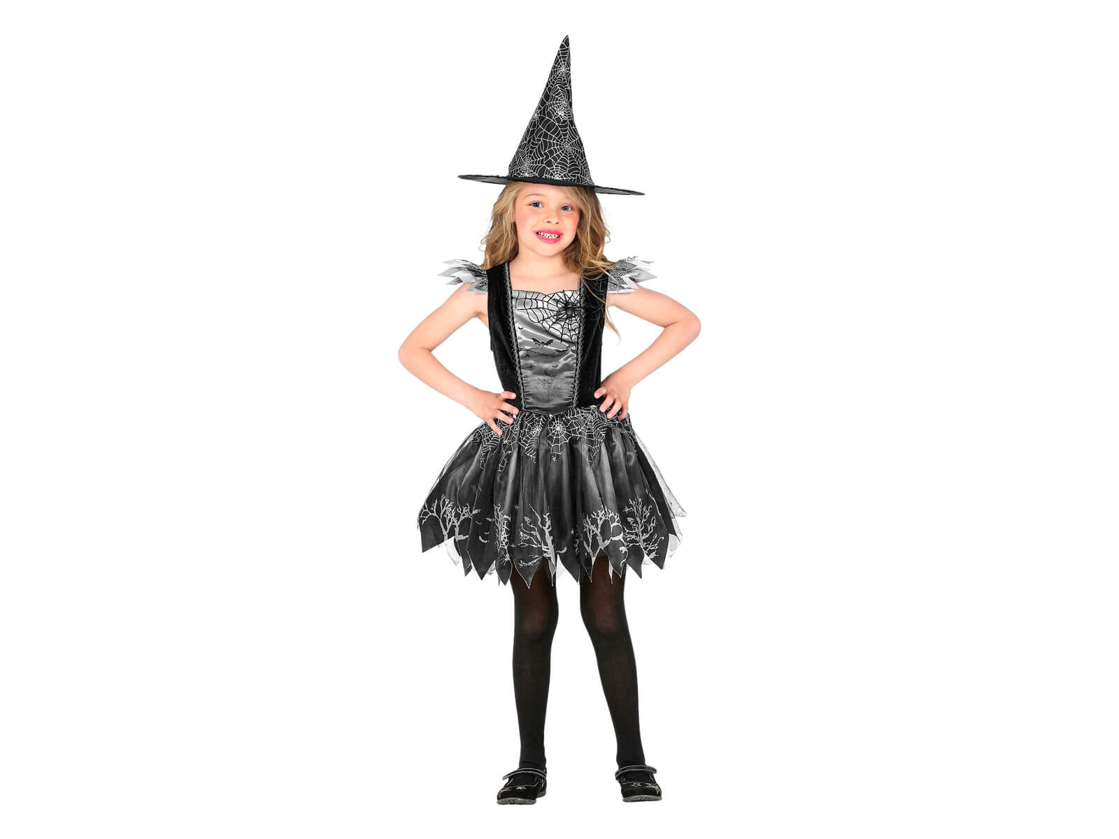 Setul include o rochie elegantă decorată cu elemente argintii care strălucesc frumos în lumină, creând un efect unic. Încântarea suplimentară va fi dată de o pălărie înaltă, de vrăjitoare, care se integrează perfect cu restul ținutei, subliniind natura sa magică.
