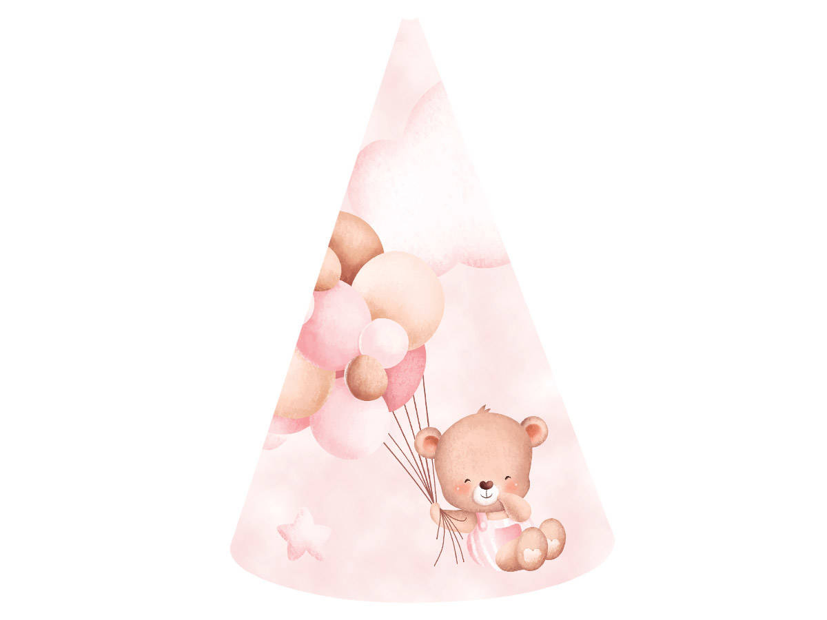 Șepci de hârtie roz Ursuleți Teddy cu baloane - 6 buc.