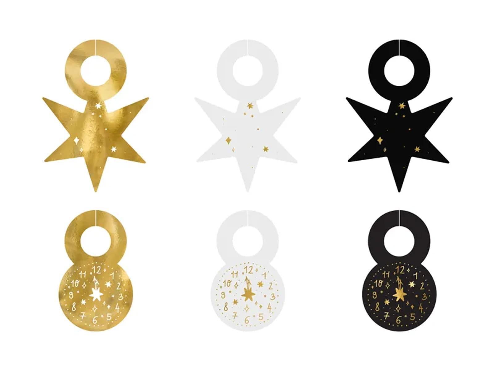 Întâmpinați Anul Nou în stil cu originalul nostru toppers de sticlă. Ideale pentru etichetarea băuturilor în timpul petrecerii de Revelion, acestea se vor asigura că fiecare invitat își poate găsi cu ușurință paharul. Fiecare topper este realizat sub forma unei stele fermecătoare, cu un motiv de ceas imprimat elegant, simbolizând numărătoarea inversă până la miezul nopții.