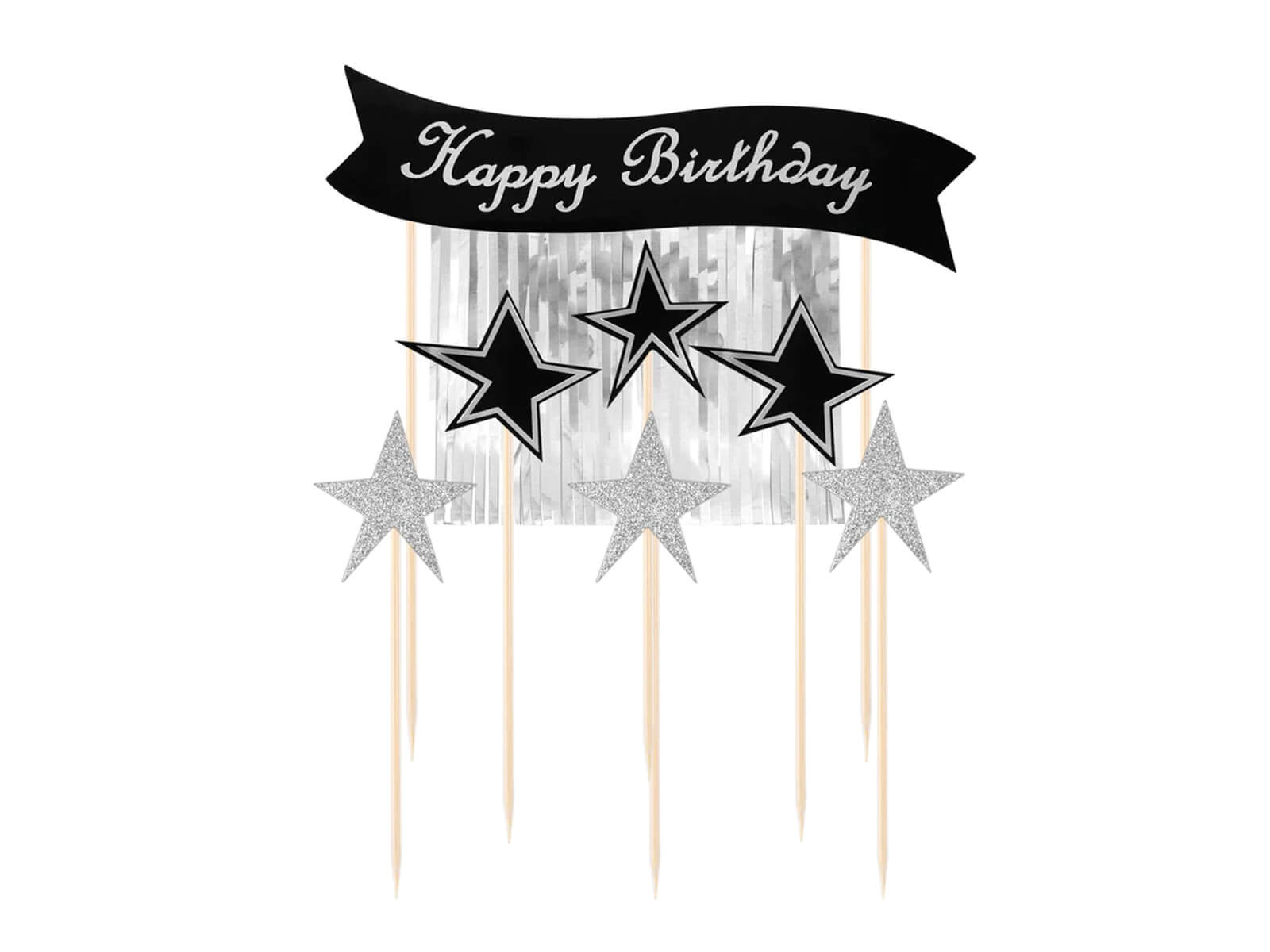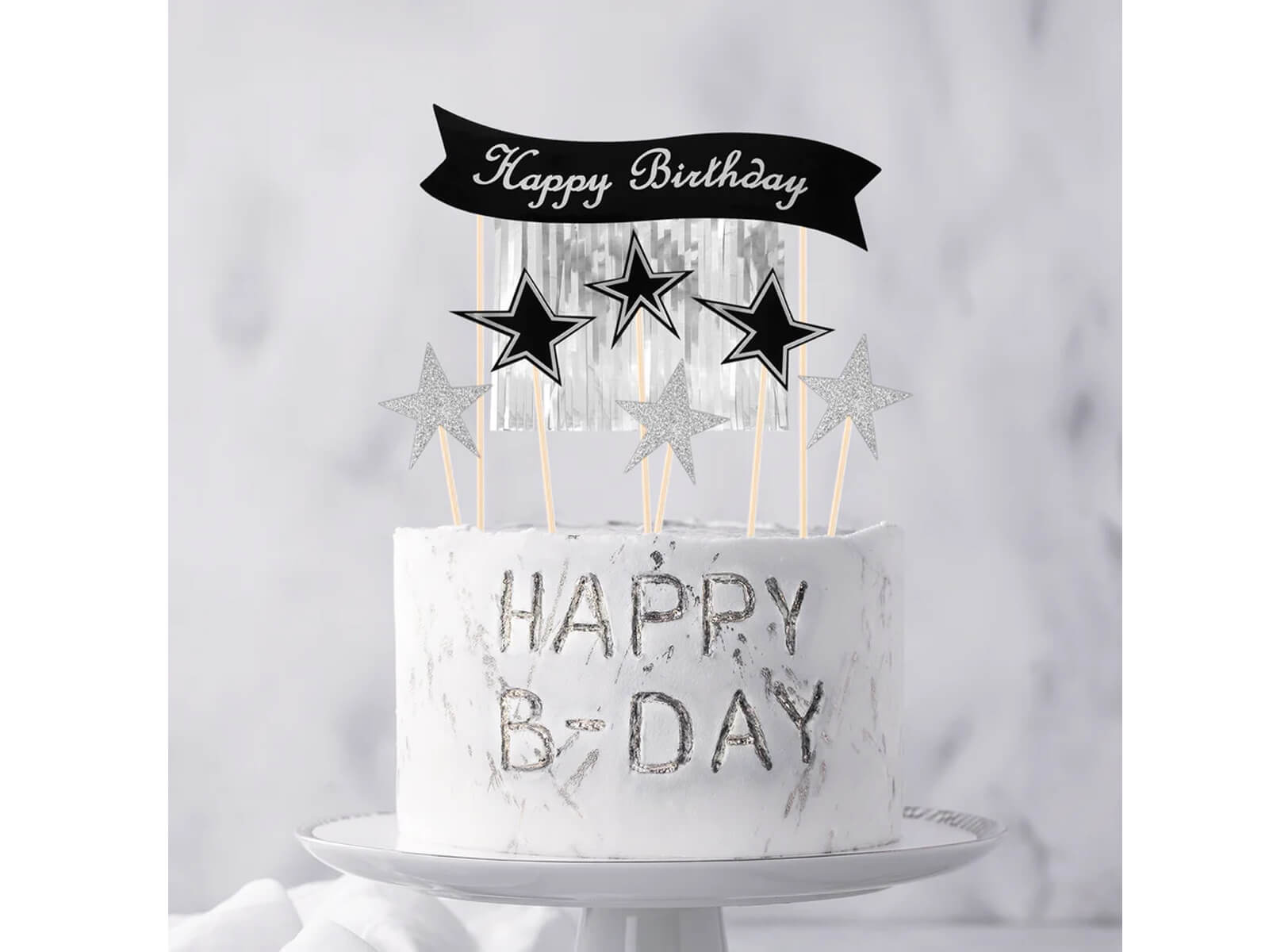 Topper de tort Happy Birthday cu culegătoare de argint - 7 buc.
