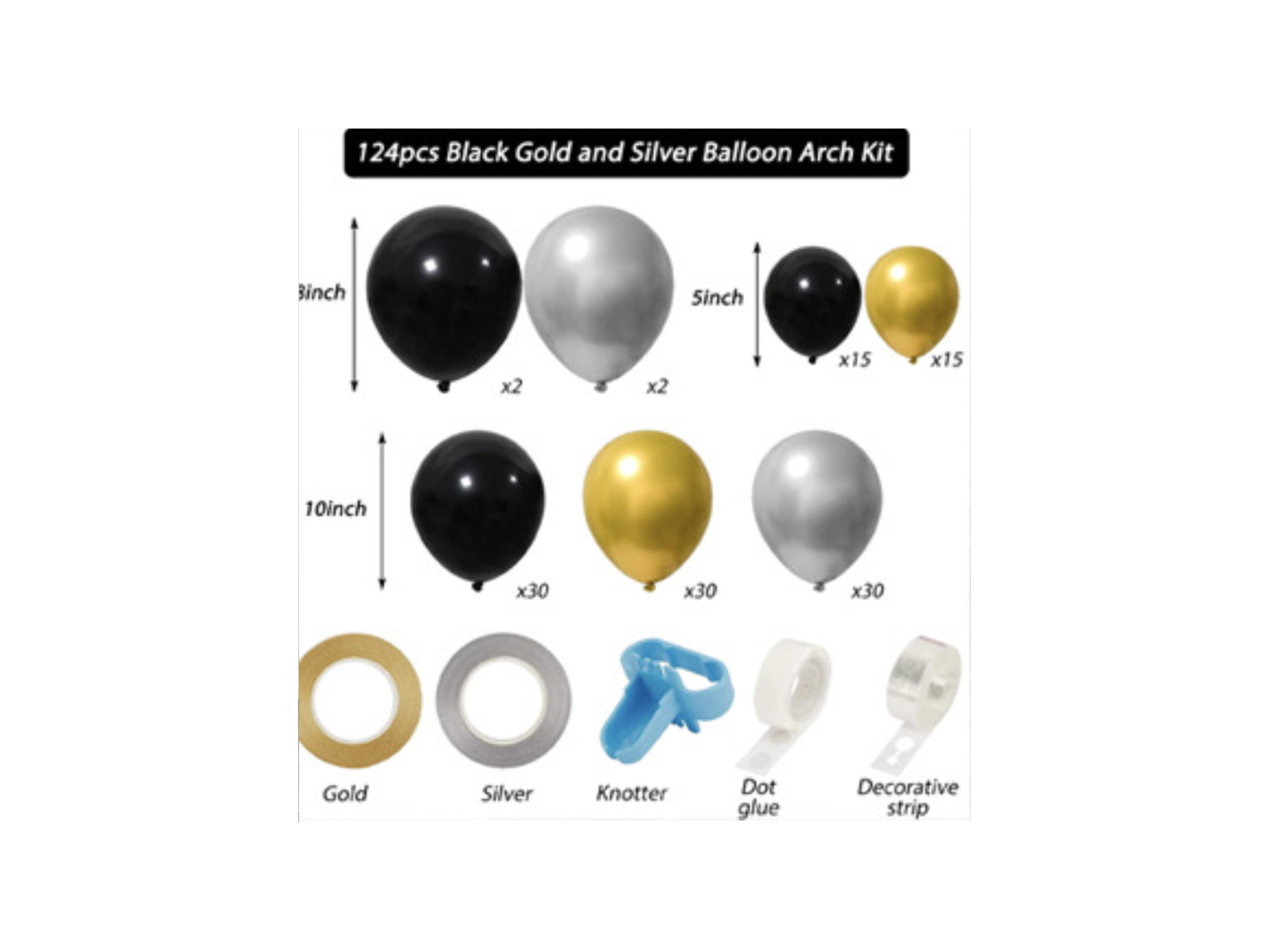 Set de baloane pentru ghirlandă în culori negru-argintiu-auriu – 124 de bucăți.
