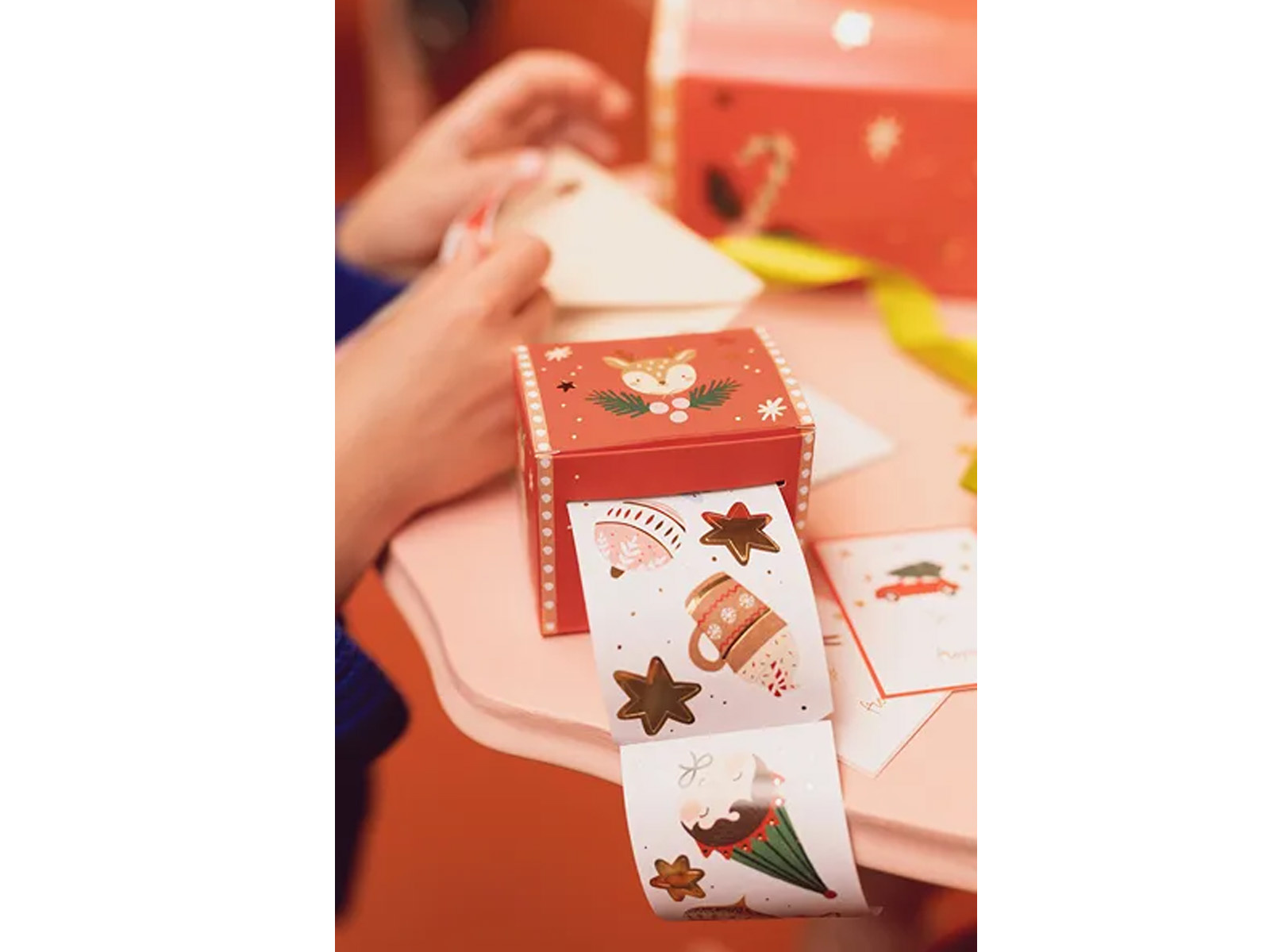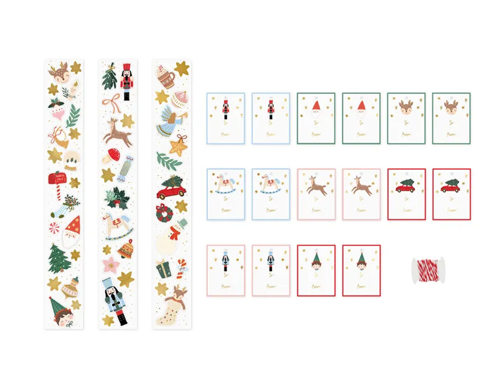 Descoperă magia Crăciunului cu setul nostru de Abțibilduri Crăciun Fericit. Îmbunătățiți decorațiunile pentru casă și cadouri cu autocolante elegante pe o temă de Crăciun. Setul conține o rolă de aproximativ 250 cm cu 52 de autocolante diferite în 36 de modele unice și 16 etichete de agățat în 8 modele diferite.