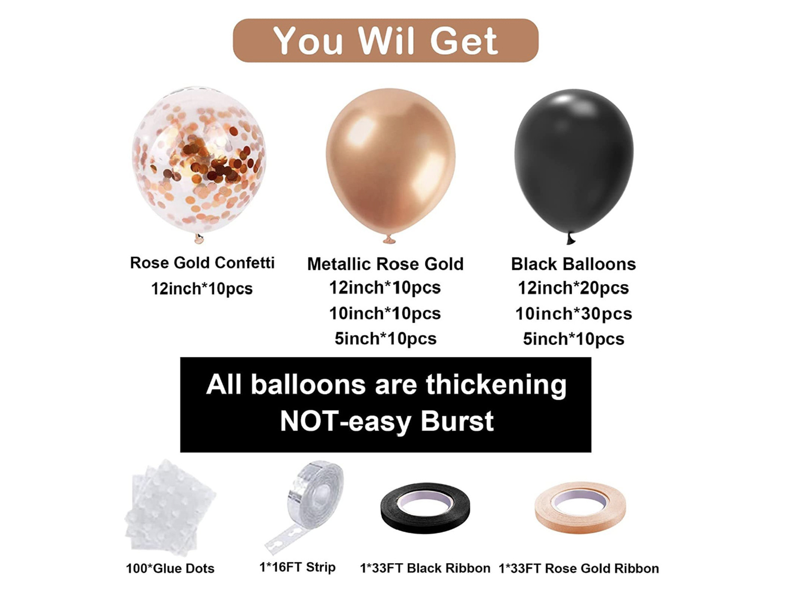 - Auriu roz metalizat: 30 cm (10 buc.), 25 cm (10 buc.), 13 cm (10 buc.)