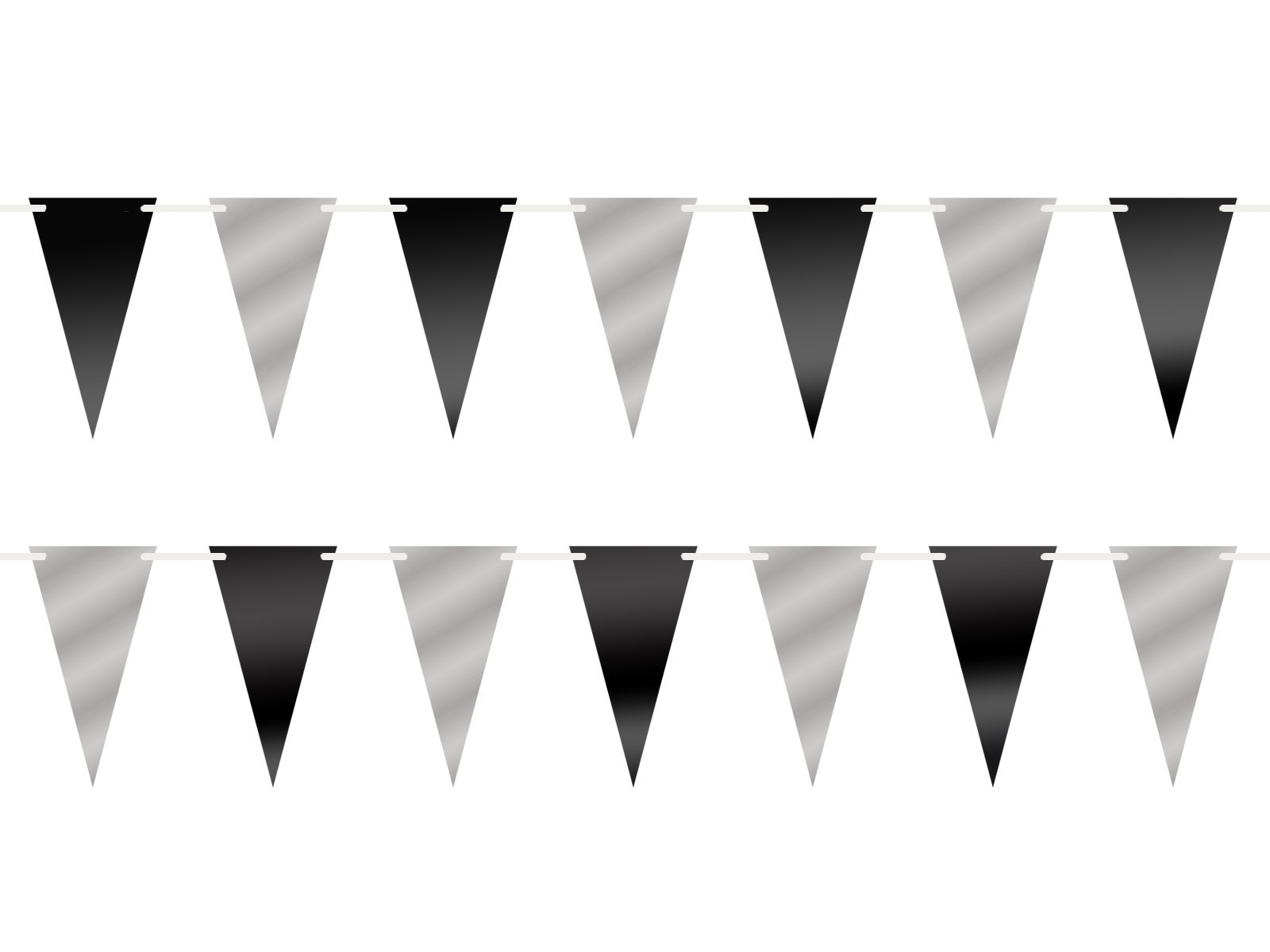 Evidențiați unicitatea evenimentului dvs. cu ghirlandă cu steaguri în culorile elegante argintiu și negru. Această decorațiune fermecătoare a fost special concepută pentru evenimente speciale, cum ar fi Revelionul, zilele de naștere sau petrecerile burlacilor și găinilor.