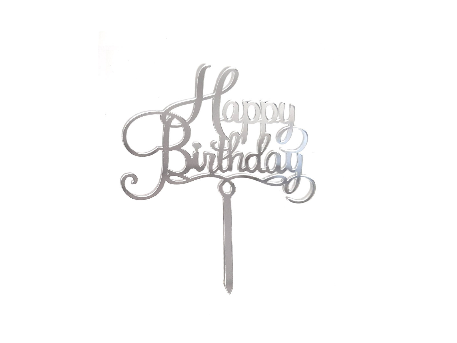 Plexiglas tort topper Happy Birthday argint - 1 buc.