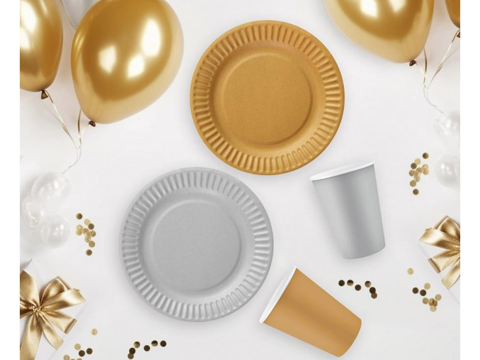 O parte esențială a oricărui eveniment! Pahare de hârtie în auriu pentru a adăuga o notă de farmec la orice petrecere. Acestea sunt ideale pentru zile de naștere, ajunul Anului Nou sau întâmpinarea noului an. Paharele nu sunt doar frumoase, ci și practice - capacitatea lor de 250 ml este ideală pentru o varietate de băuturi, de la ceaiuri fierbinți la băuturi reci.