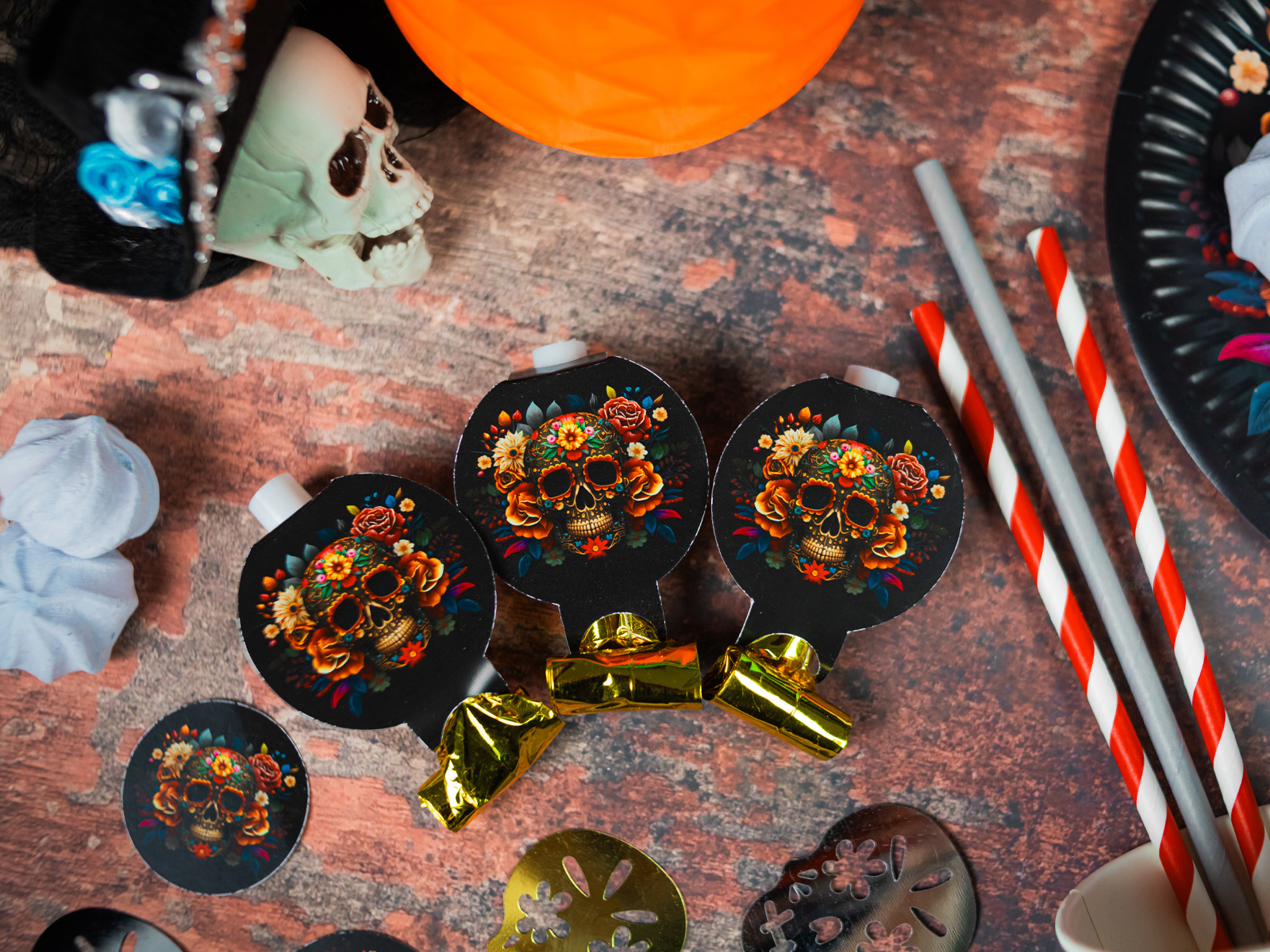 Pregătiți-vă pentru o sărbătoare de neuitat cu dia De Los Muertos fluierături trompetă roll-out. Setul include șase trompete colorate, fiecare decorată cu o imprimare unică de craniu mexican, perfectă pentru Halloween sau alte petreceri tematice. Aceste accesorii energice vor încânta orice petrecere, iar designul lor original, care amintește de faimoasele sărbători mexicane, va face ca petrecerea dvs. să se distingă de restul.