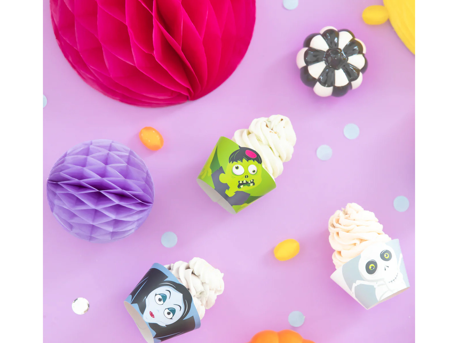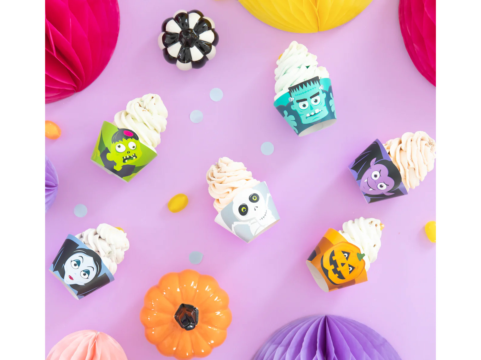 Aceste cupcakes unice au pe ele grafice care înfățișează personaje populare de Halloween, cum ar fi zombi, Frankenstein, un vampir, un schelet, un dovleac și un vampir, care sunt sigur că îi vor încânta nu numai pe cei mici. Dimensiunile fiecărei forme sunt 7,5 cm lățime i 4,5 cm înălțime, perfect potrivit pentru brioșe și cupcakes standard.