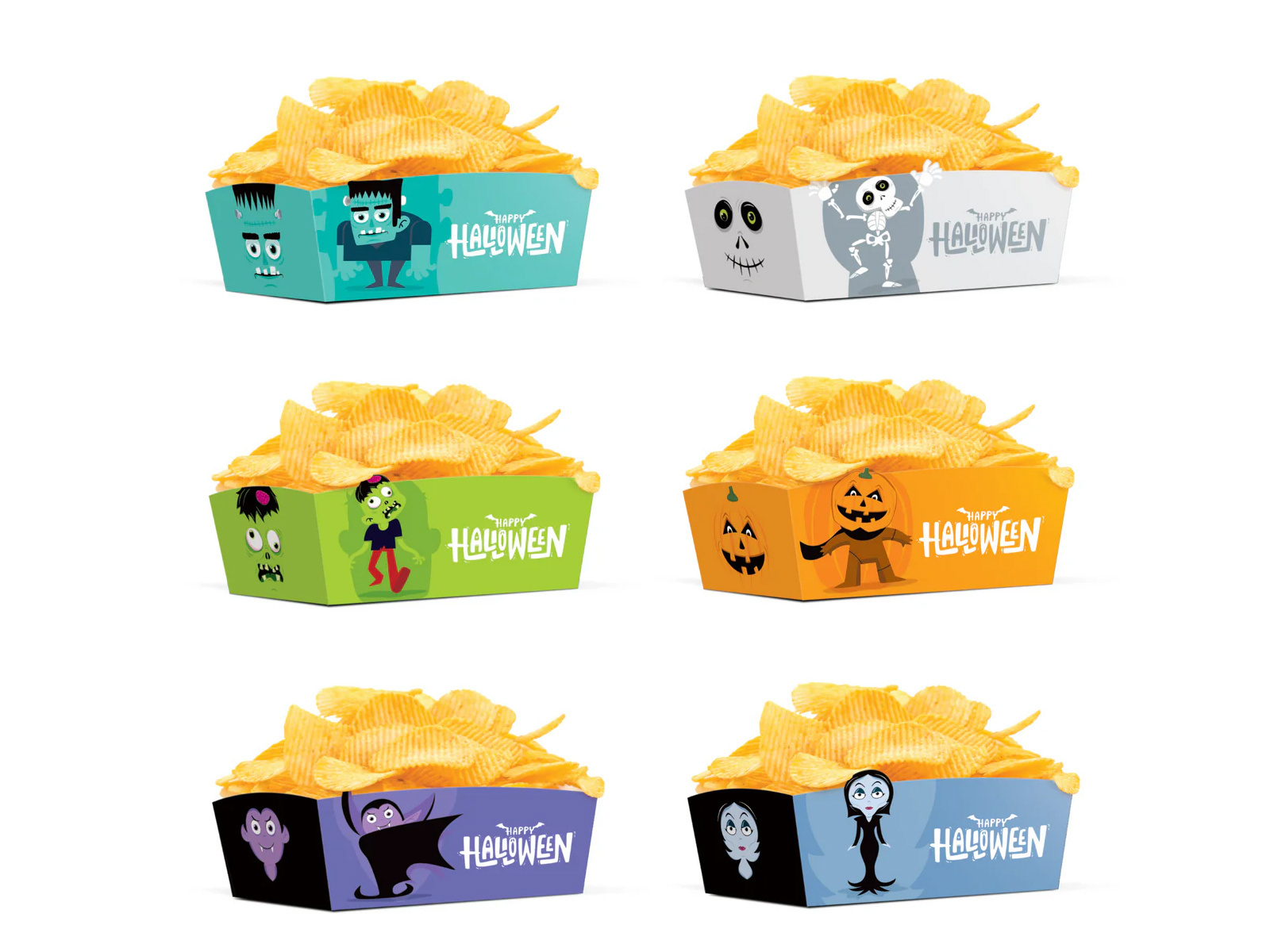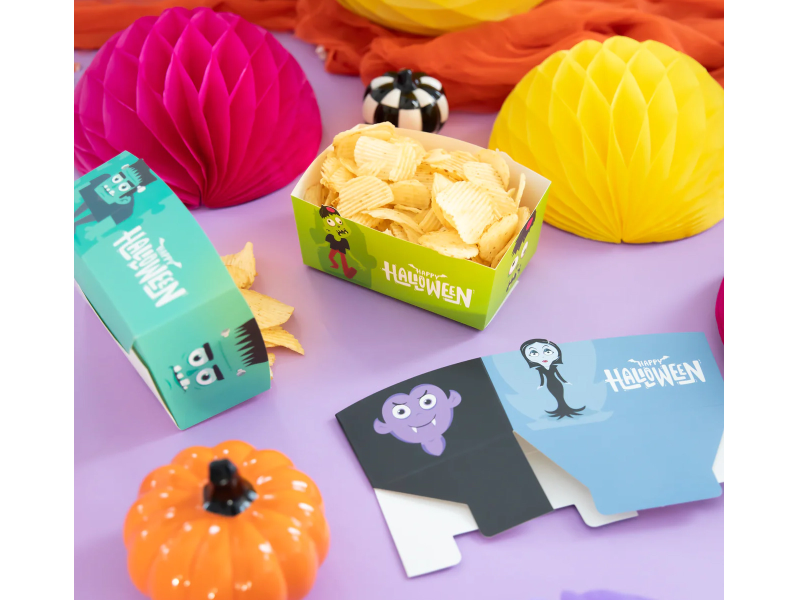 Pregătiți-vă pentru un Halloween de neuitat cu cutii de hârtie pentru chipsuri Monsters. Ideal nu numai pentru chipsuri, ci și pentru popcorn și alte dulciuri pe care doriți să le serviți la petrecerea de Crăciun. Dimensiunile fiecărei cutii sunt de 15 cm lățime, 10 cm adâncime și 7 cm înălțime, ceea ce le face extrem de practice de utilizat.