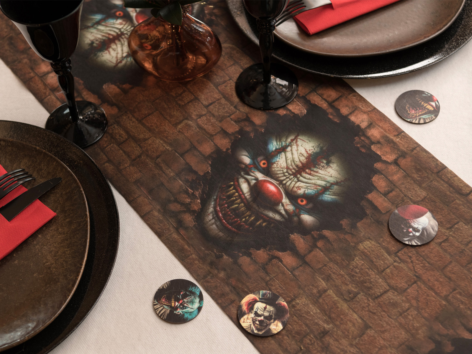 O imprimare realistă a unui clovn înfricoșător contribuie la atmosferă și poate fi fundalul perfect pentru mâncarea și decorațiunile de Halloween. Fie că planificați o petrecere intimă cu cei dragi sau un eveniment mare, un alergător Clovn ucigaș este o alegere ideală, care cu siguranță va atrage atenția oaspeților dumneavoastră.
